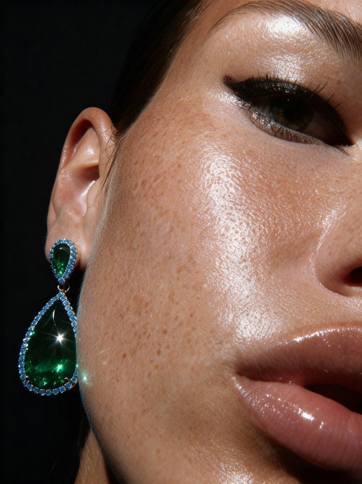 Close-up of a face with radiant skin, glossy lips, and a sparkling green gemstone earring surrounded by blue stones.