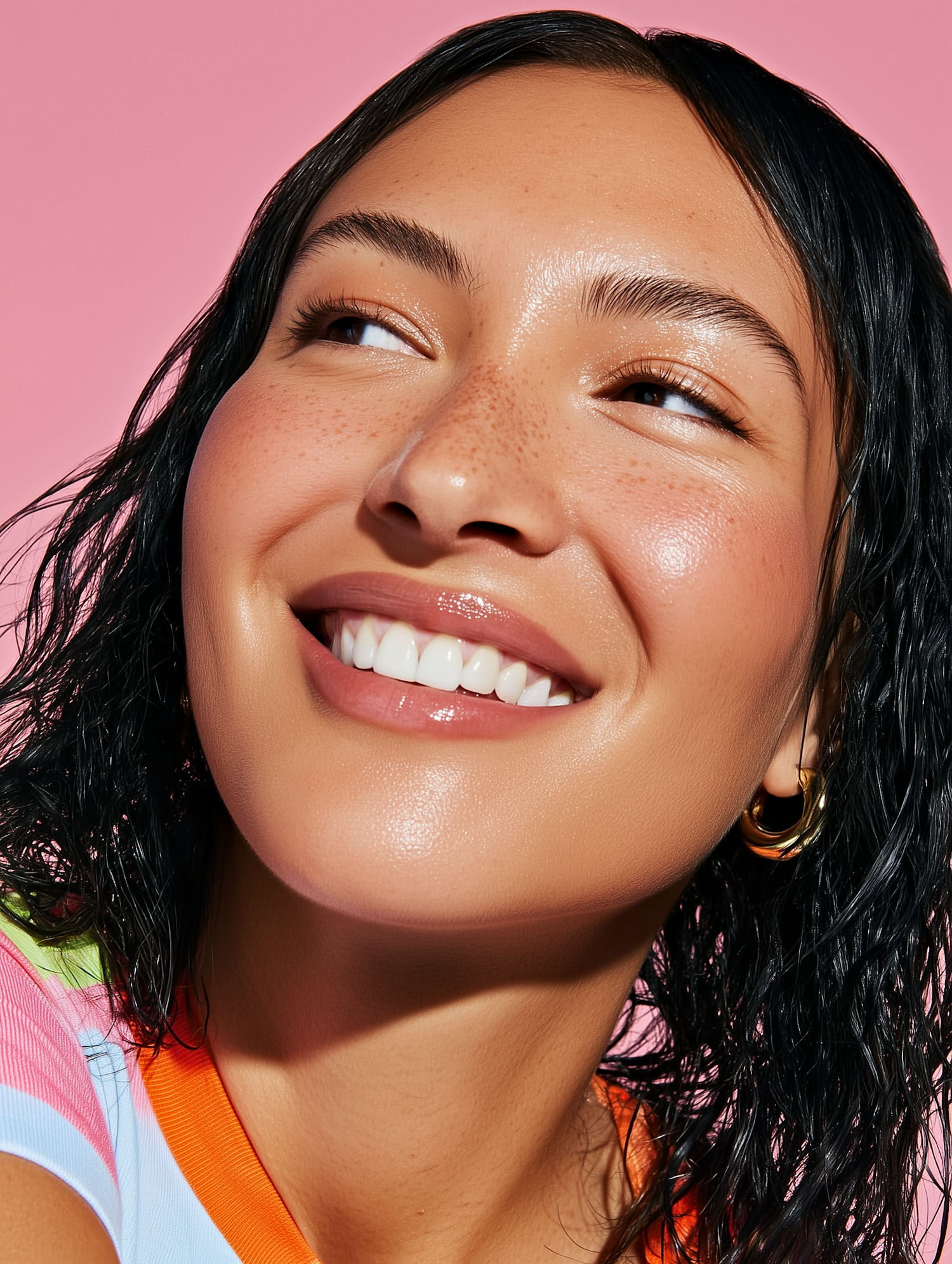 Close-up of a smiling person with freckles, glossy lips, and gold hoop earrings against a vibrant pink background.