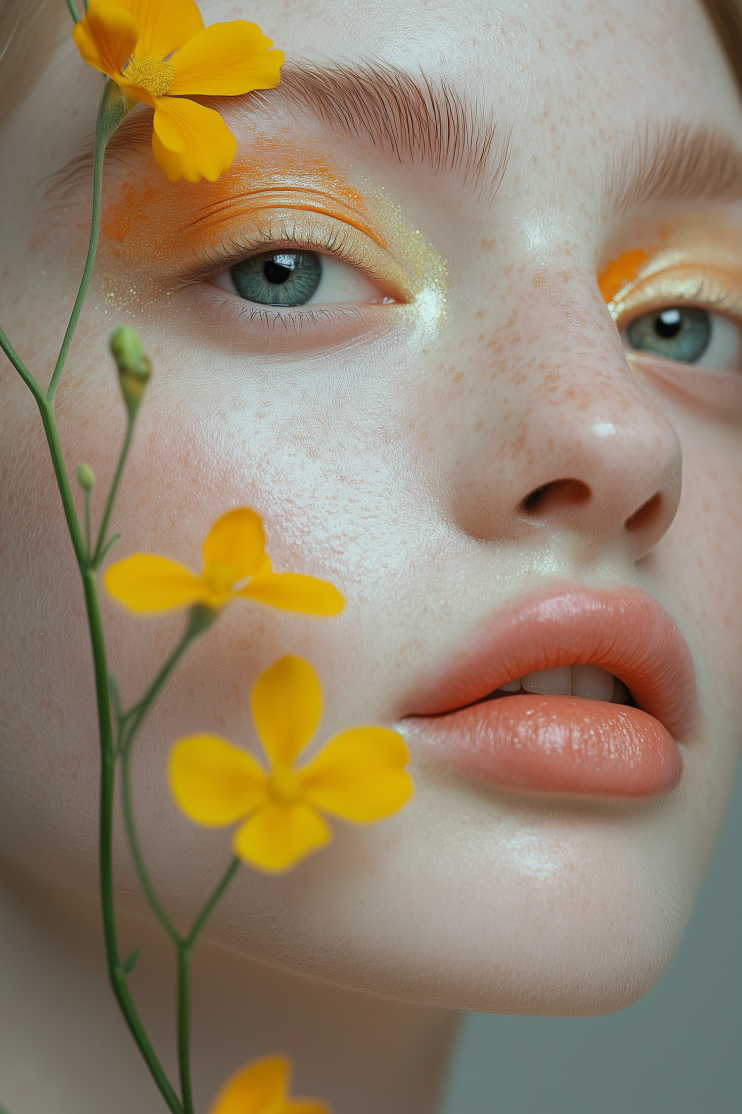 Close-up of a freckled face with vibrant orange eyeshadow, peach lips, and a yellow flower, creating a fresh and artistic vibe.