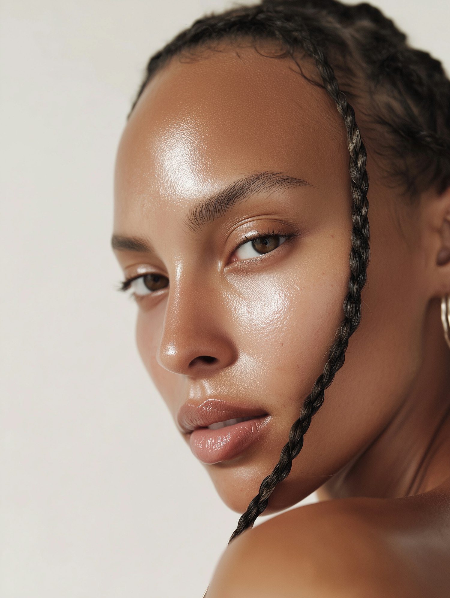 Close-up portrait of a person with glowing skin and braided hair, showcasing natural beauty and expressive features.