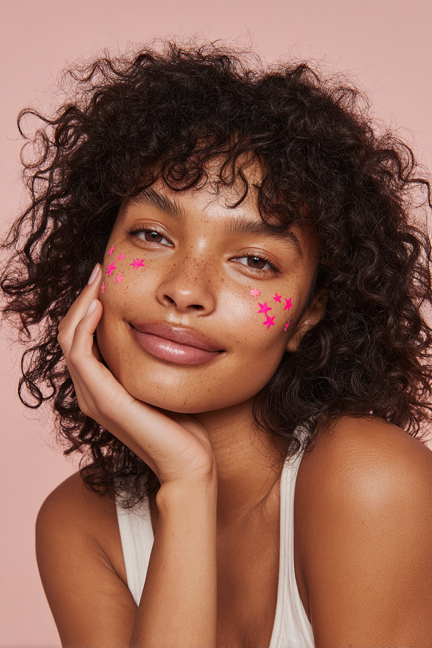A close-up of a smiling woman with curly hair and pink star decorations on her cheeks, set against a soft pink background.