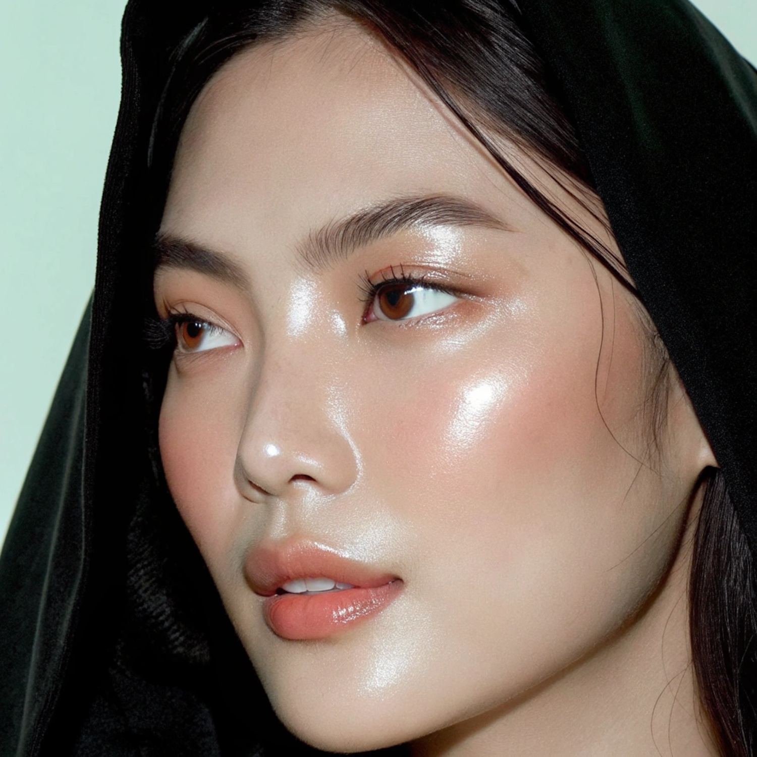 Close-up of a woman with glowing skin, minimal makeup, and a black hood framing her face against a soft green background.