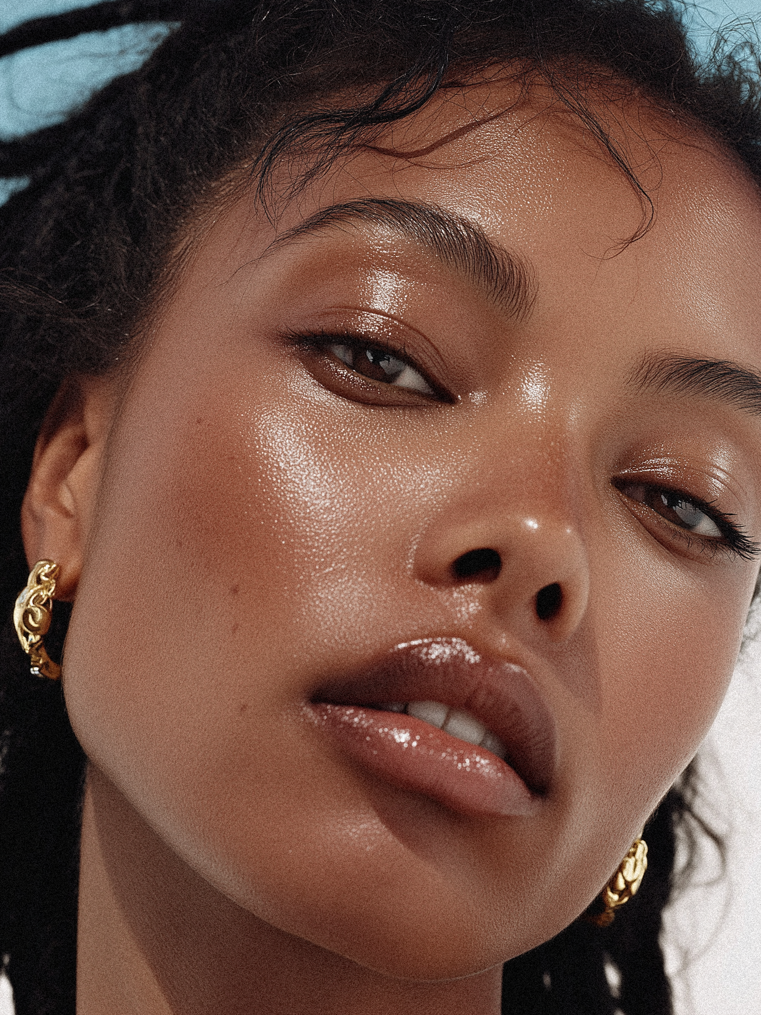 Close-up of a person with glowing skin, natural makeup, and gold earrings, set against a soft blue background.