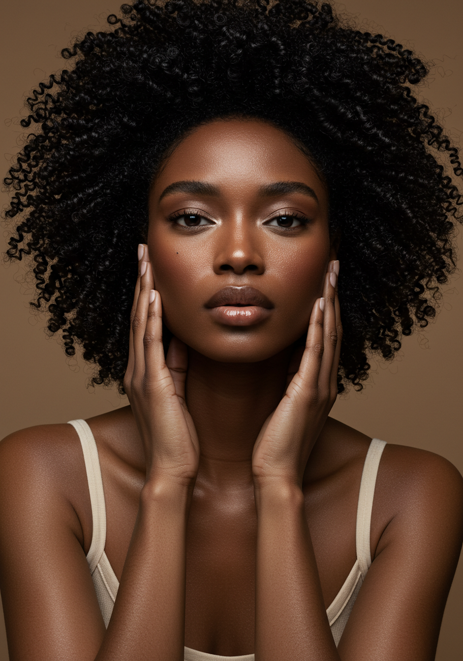 A stunning portrait of a woman with glowing skin, natural curls, and a calm expression, framed by a warm, neutral background.