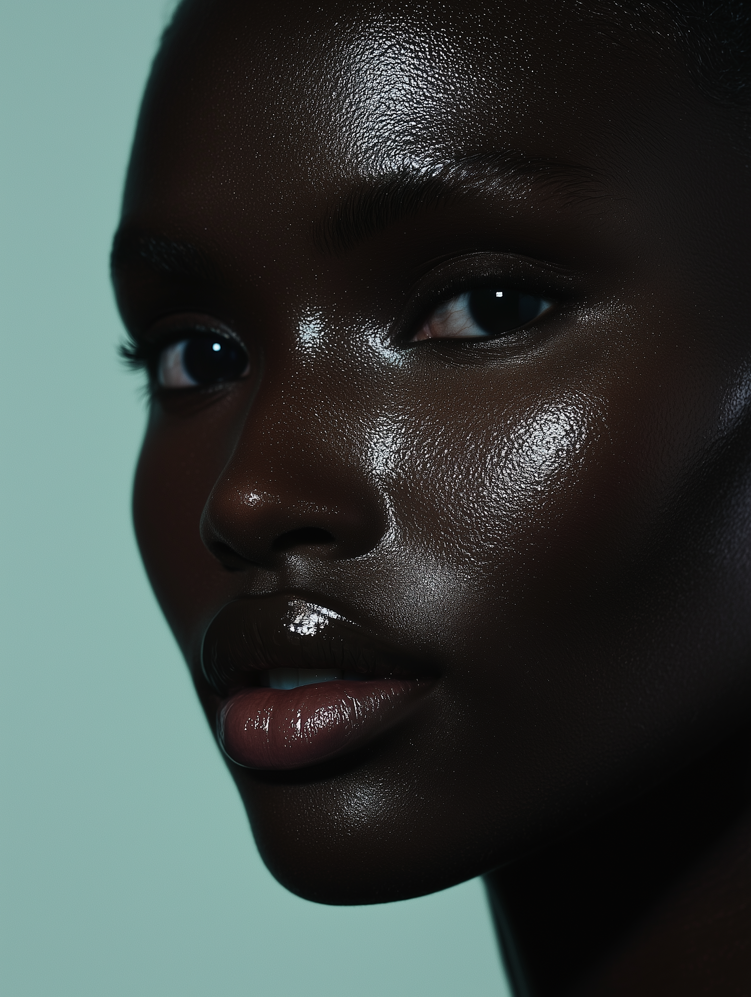 Close-up of a woman with radiant dark skin, glossy lips, and striking features against a soft mint green background.