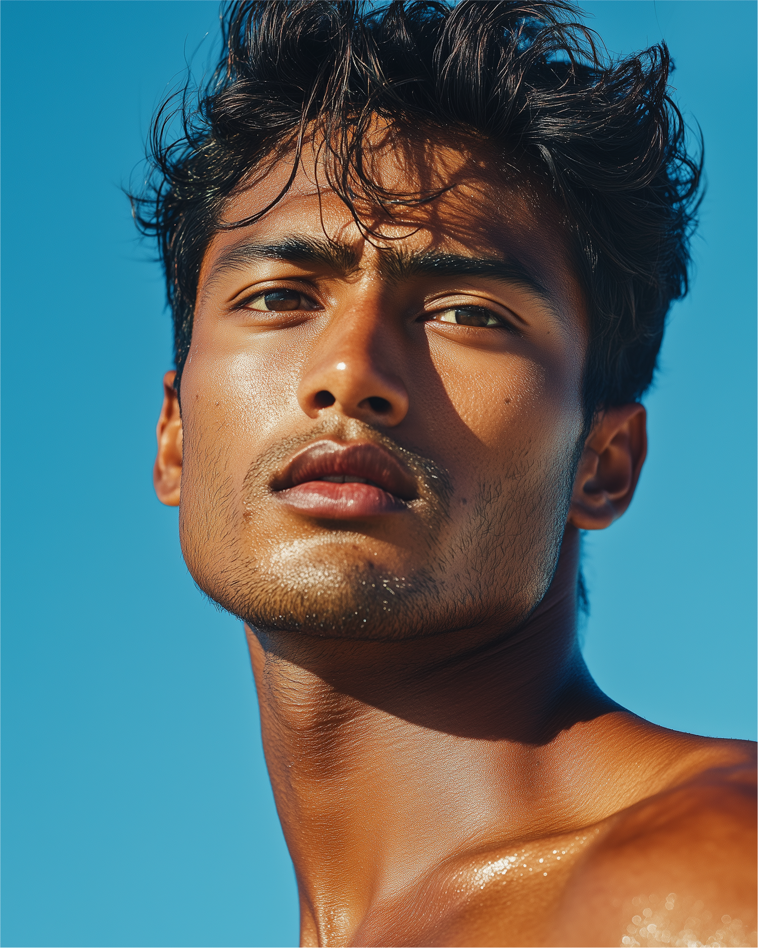 Close-up of a young man with tousled hair, light brown eyes, and glowing skin against a vibrant blue sky. Perfect summer vibe!