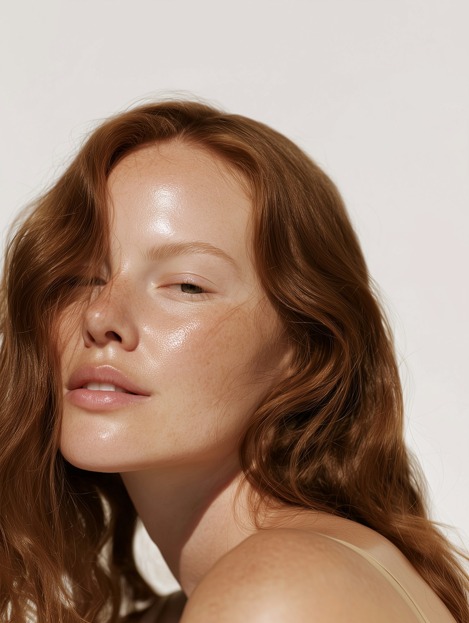 Close-up of a person with glowing skin and red hair, showcasing natural beauty and a serene expression against a neutral background.