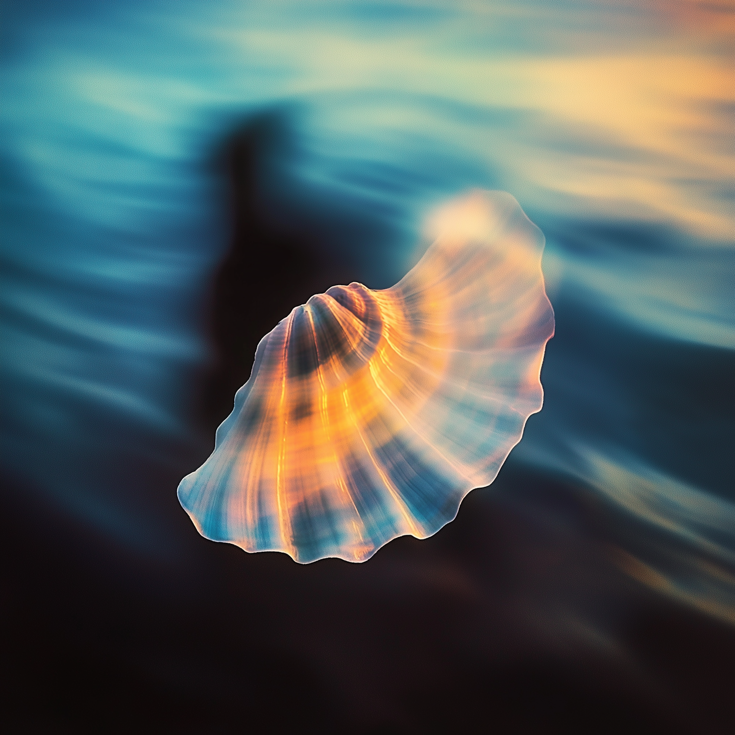 A glowing seashell with vibrant orange and blue hues against a dreamy, blurred oceanic background. Perfect for serene, artistic vibes.