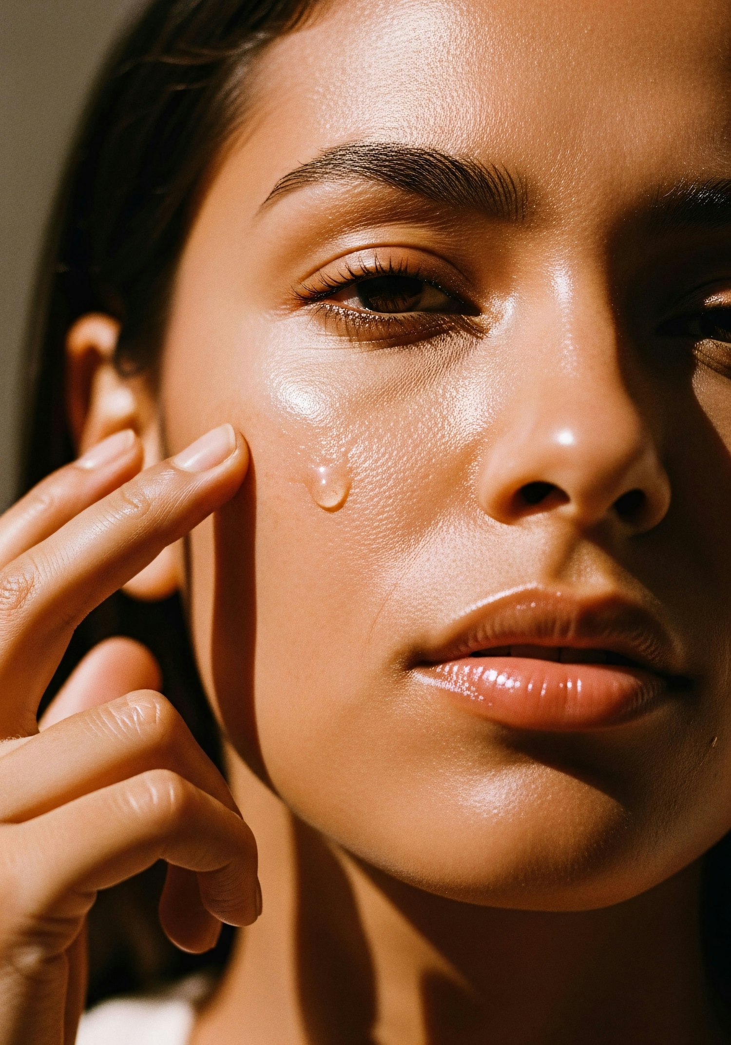 Close-up of a person's radiant skin with a drop of liquid on the cheek, highlighting natural beauty and skincare.