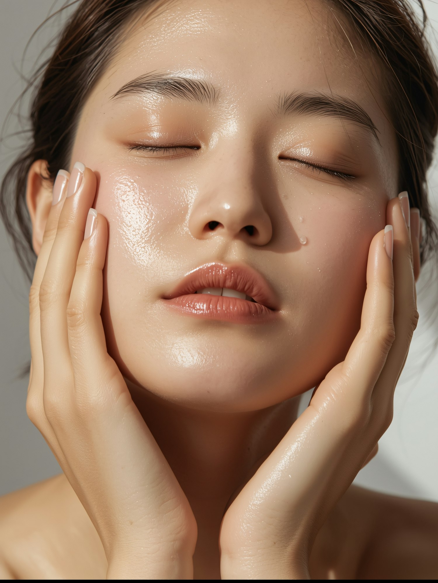 Close-up of a person with glowing, hydrated skin, gently touching their face, showcasing a radiant and dewy complexion.