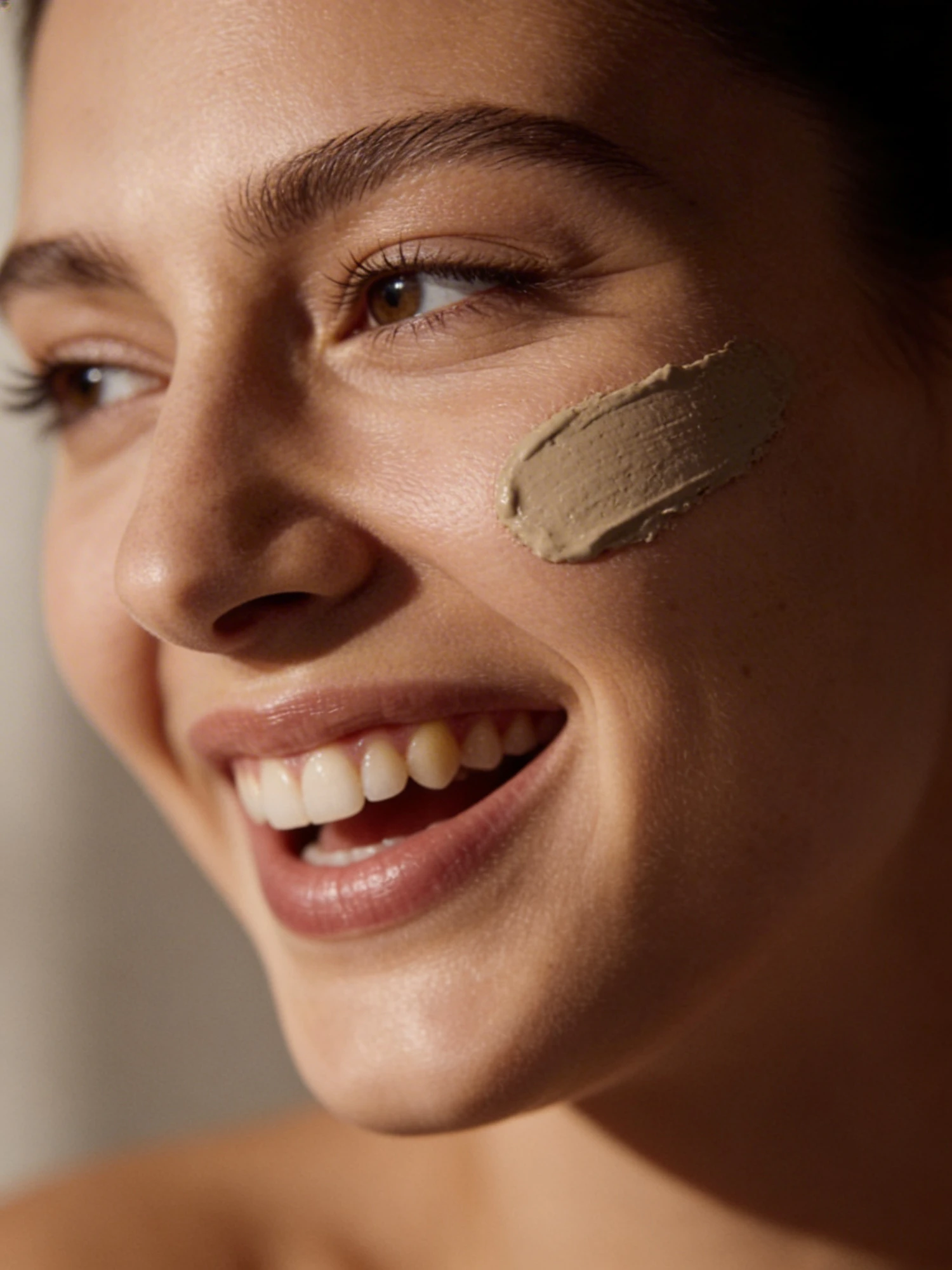 Close-up of a smiling person with radiant skin and a skincare product applied to their cheek, emphasizing natural beauty and self-care.