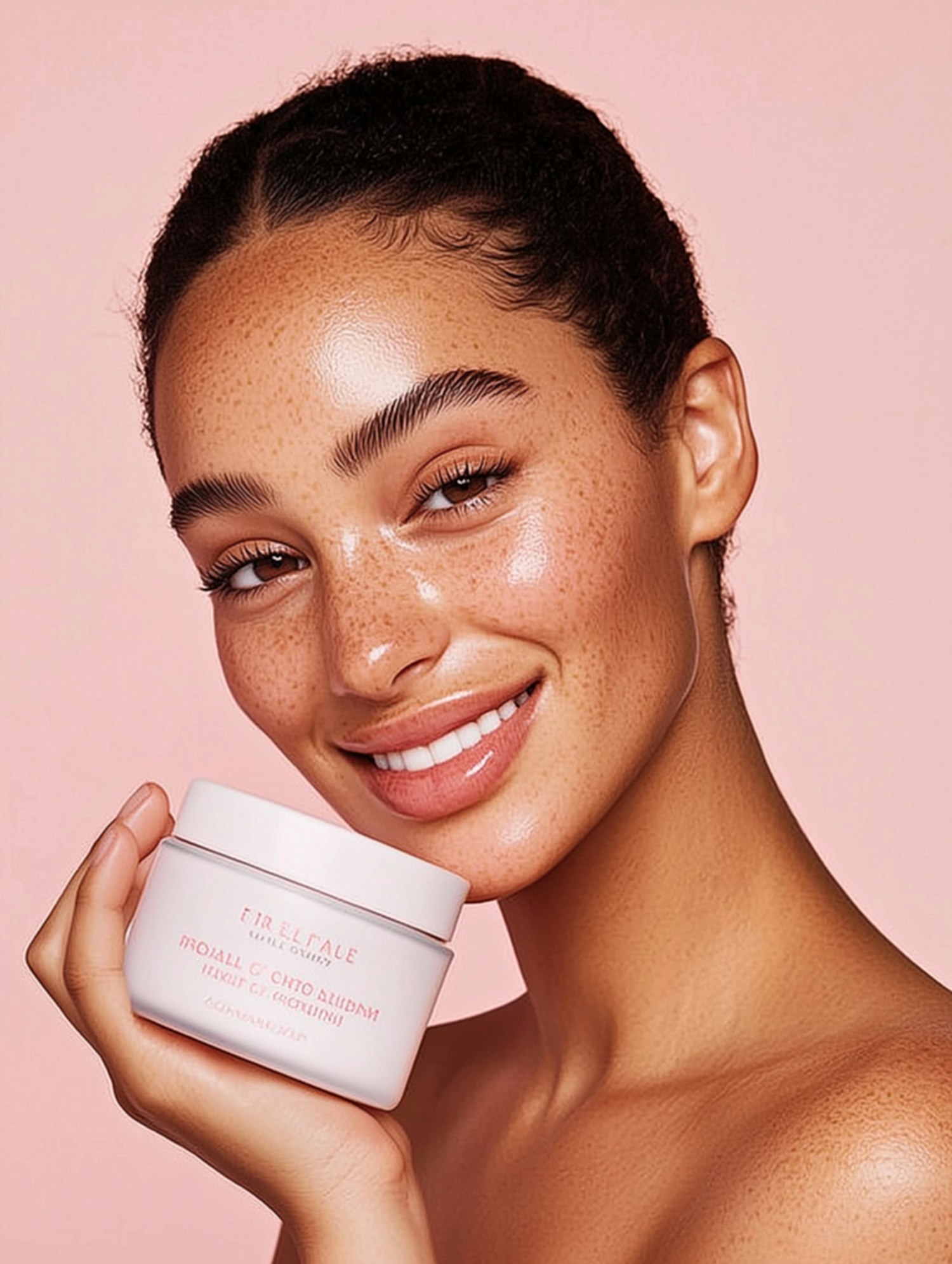 A smiling woman with glowing skin and freckles holds a white skincare jar against a soft pink background, radiating natural beauty.