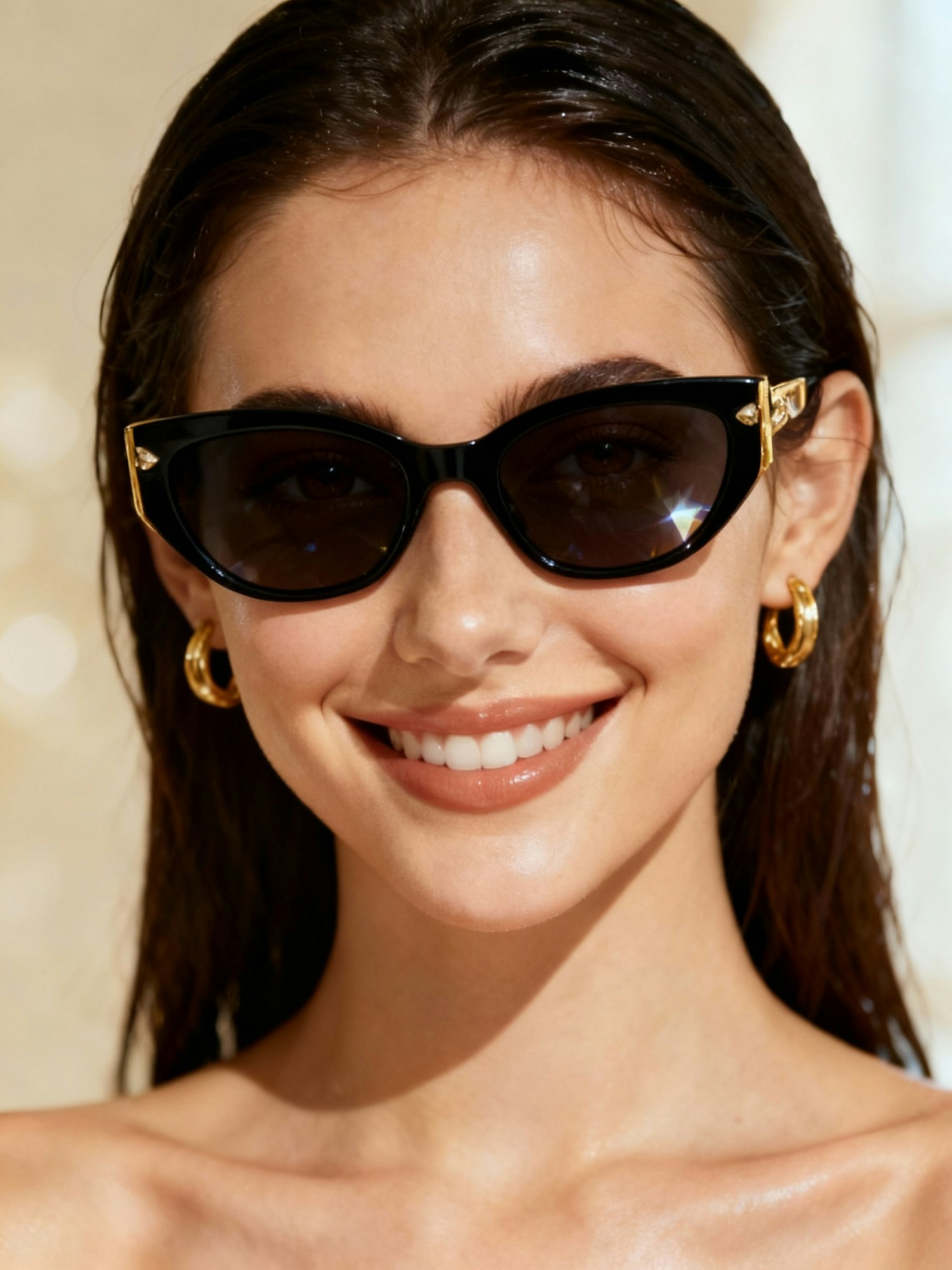 Close-up of a smiling person wearing black sunglasses with gold accents and gold hoop earrings, set against a softly lit background.