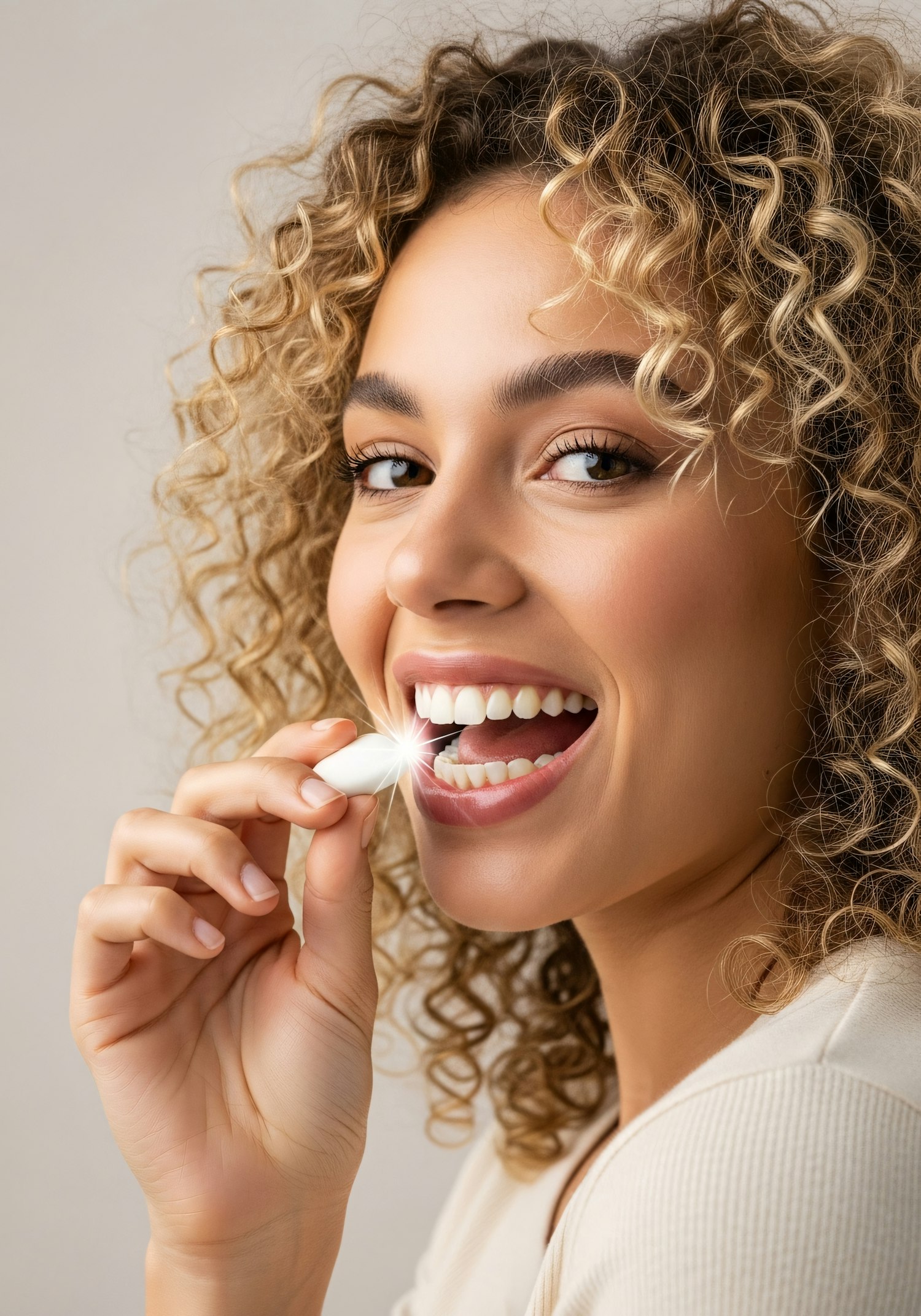 A smiling woman with curly blonde hair holding a piece of gum, showcasing bright teeth and a fresh, clean look.