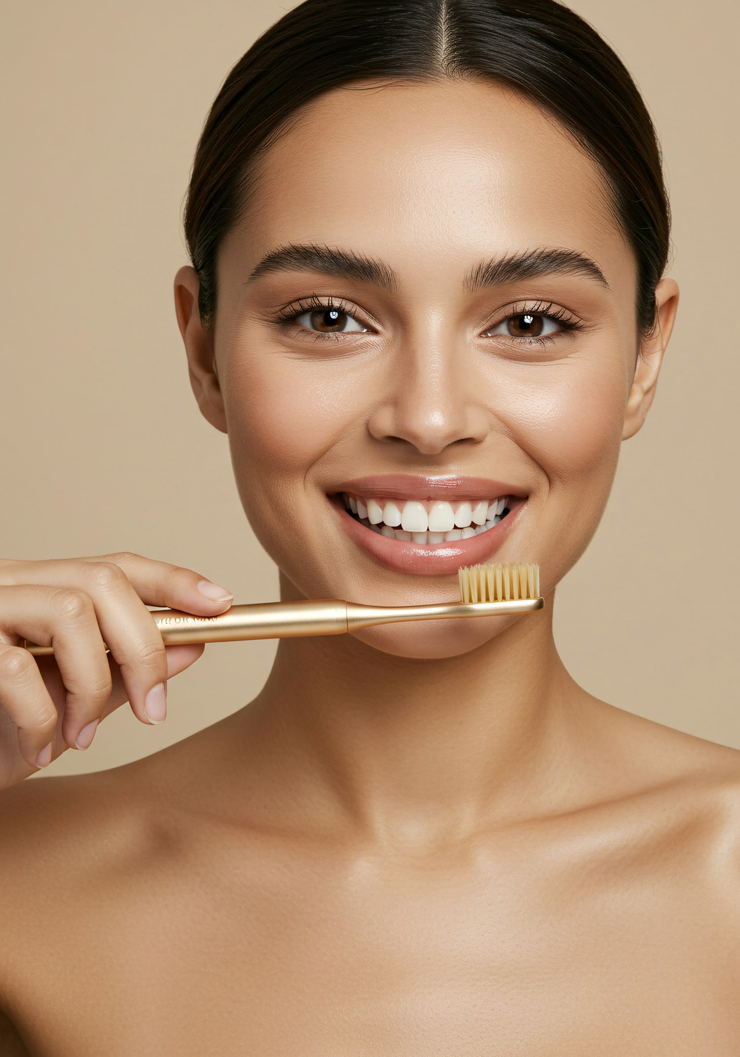 A smiling woman holding a golden toothbrush against a beige background, showcasing dental care and hygiene in a clean, minimalistic style.