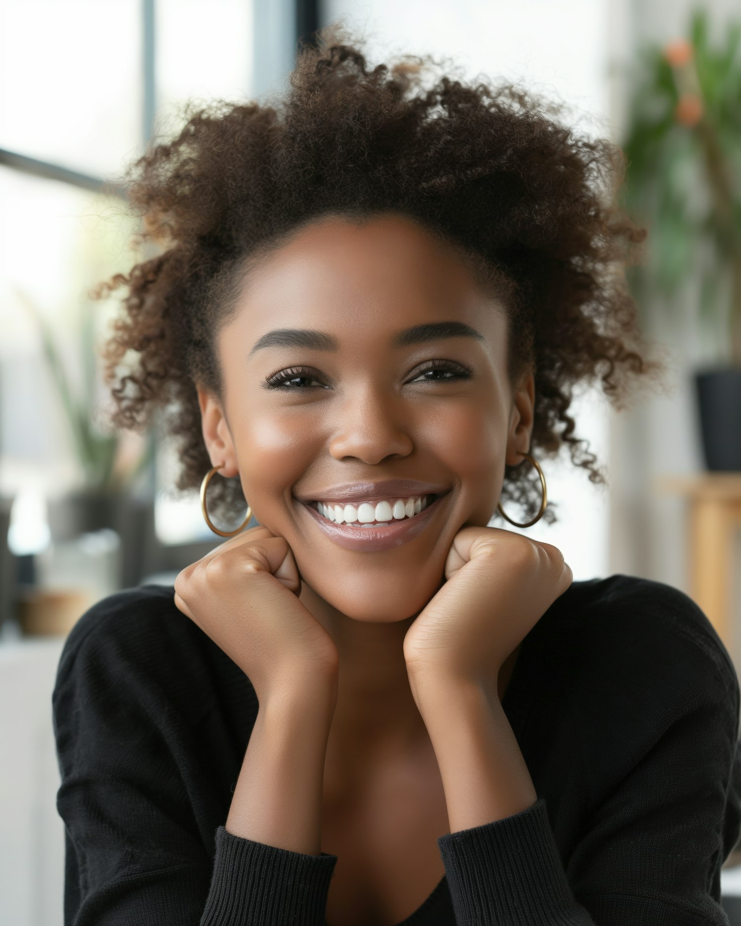 Smiling young Black woman with curly hair and hoop earrings, resting her chin on her hands in a cozy indoor setting.