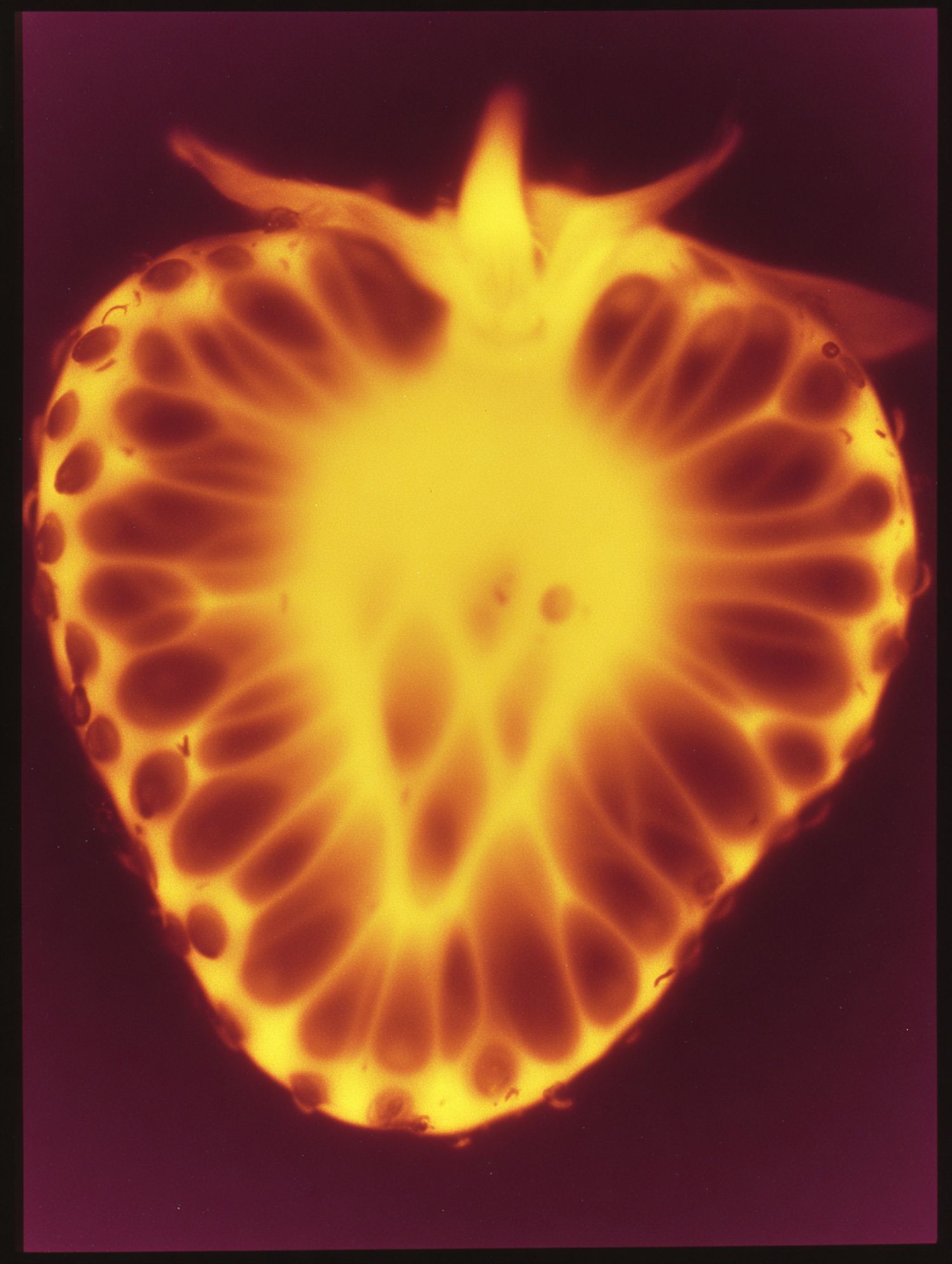 A glowing, abstract view of a strawberry slice, highlighting its intricate structure with vibrant yellow-orange hues against a dark background.