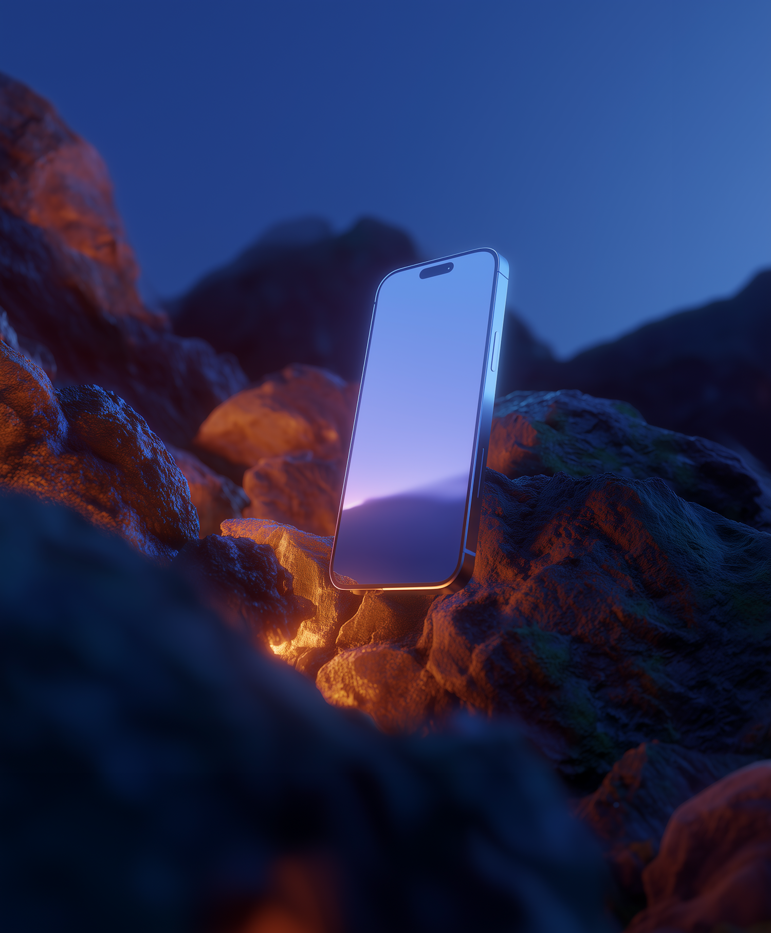 A smartphone stands among glowing rocks under a blue sky, blending technology with a surreal, natural setting.