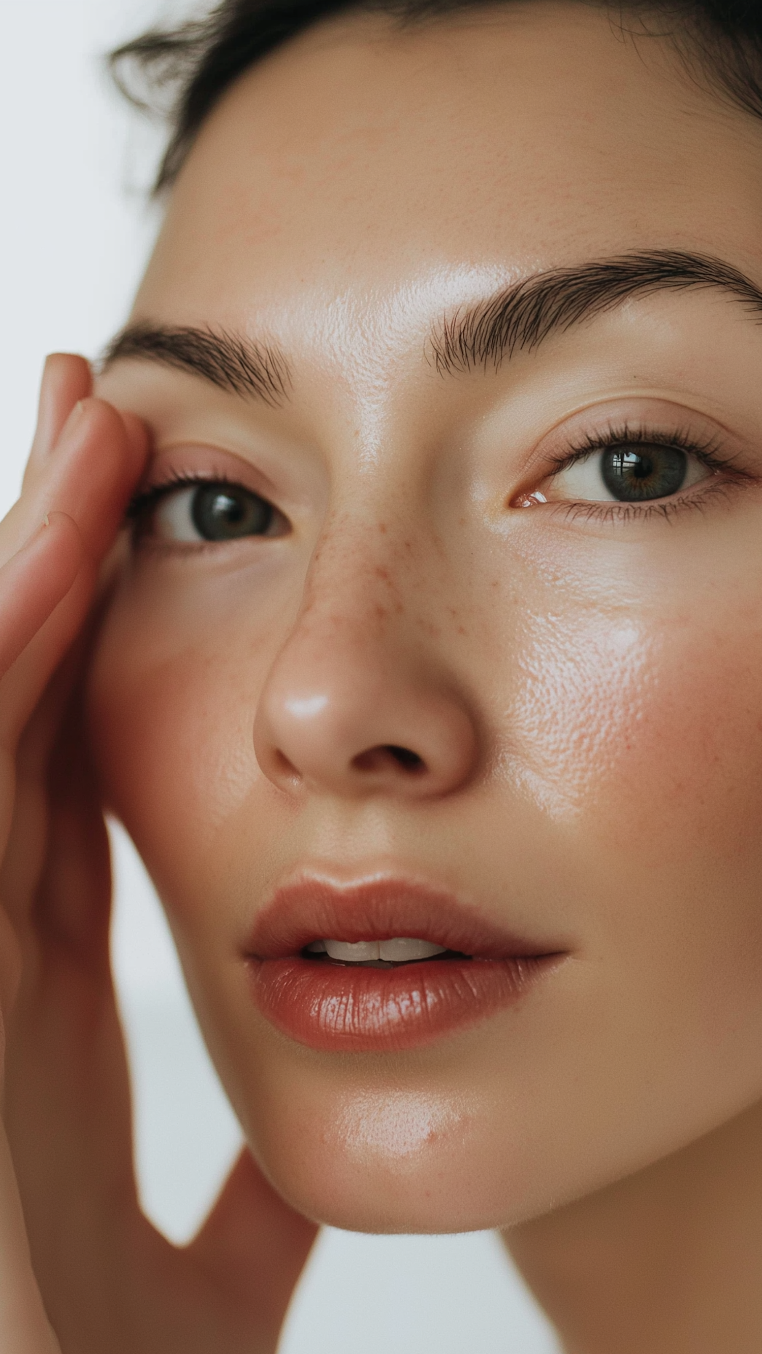 Close-up of a woman with radiant skin, freckles, green eyes, and natural makeup, highlighting her dewy complexion and soft features.