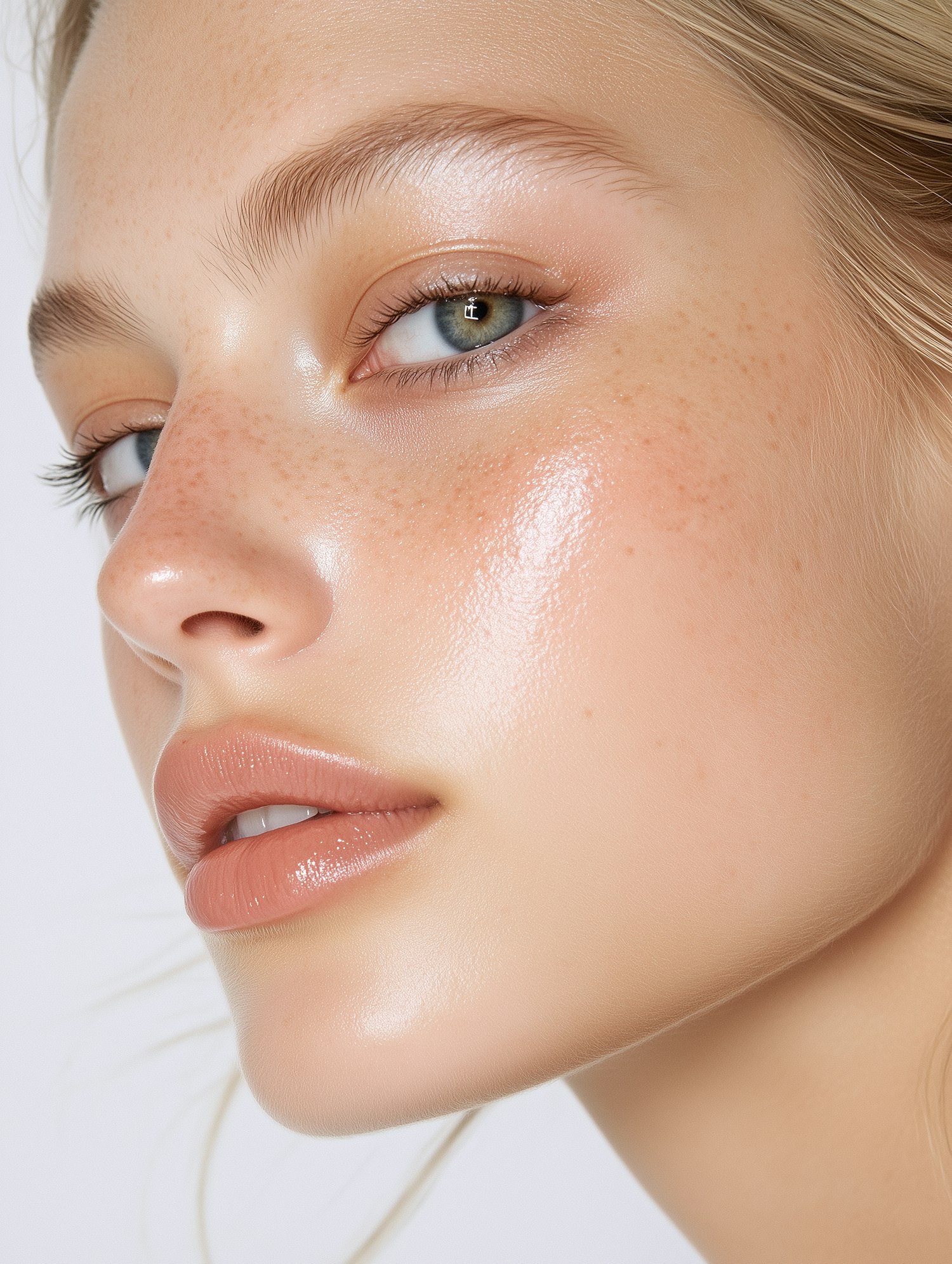 Close-up of a woman with glowing skin, light freckles, blue-green eyes, and glossy nude lips, showcasing a natural and radiant look.