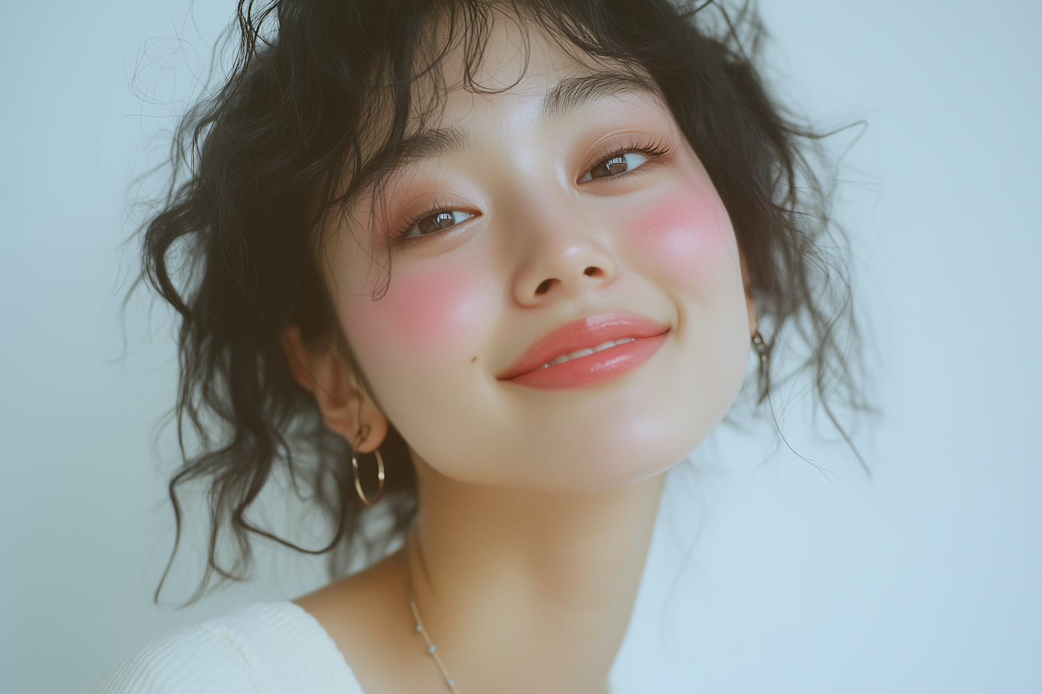 Close-up of a cheerful woman with rosy cheeks, glossy lips, and wavy black hair, set against a soft pale blue background.