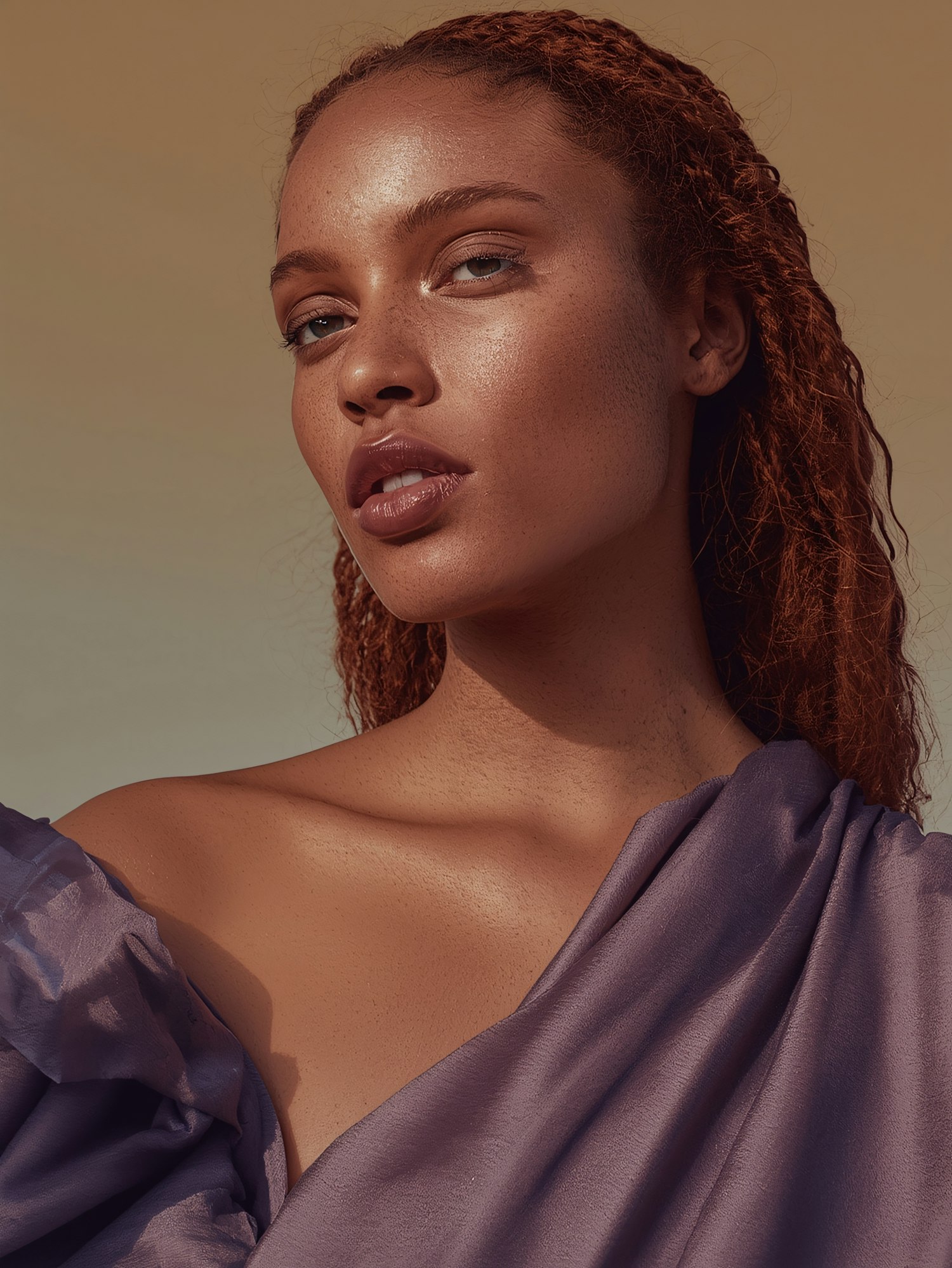 A stunning portrait of a woman with freckles, red hair, and a purple off-shoulder outfit, set against a warm-toned background.