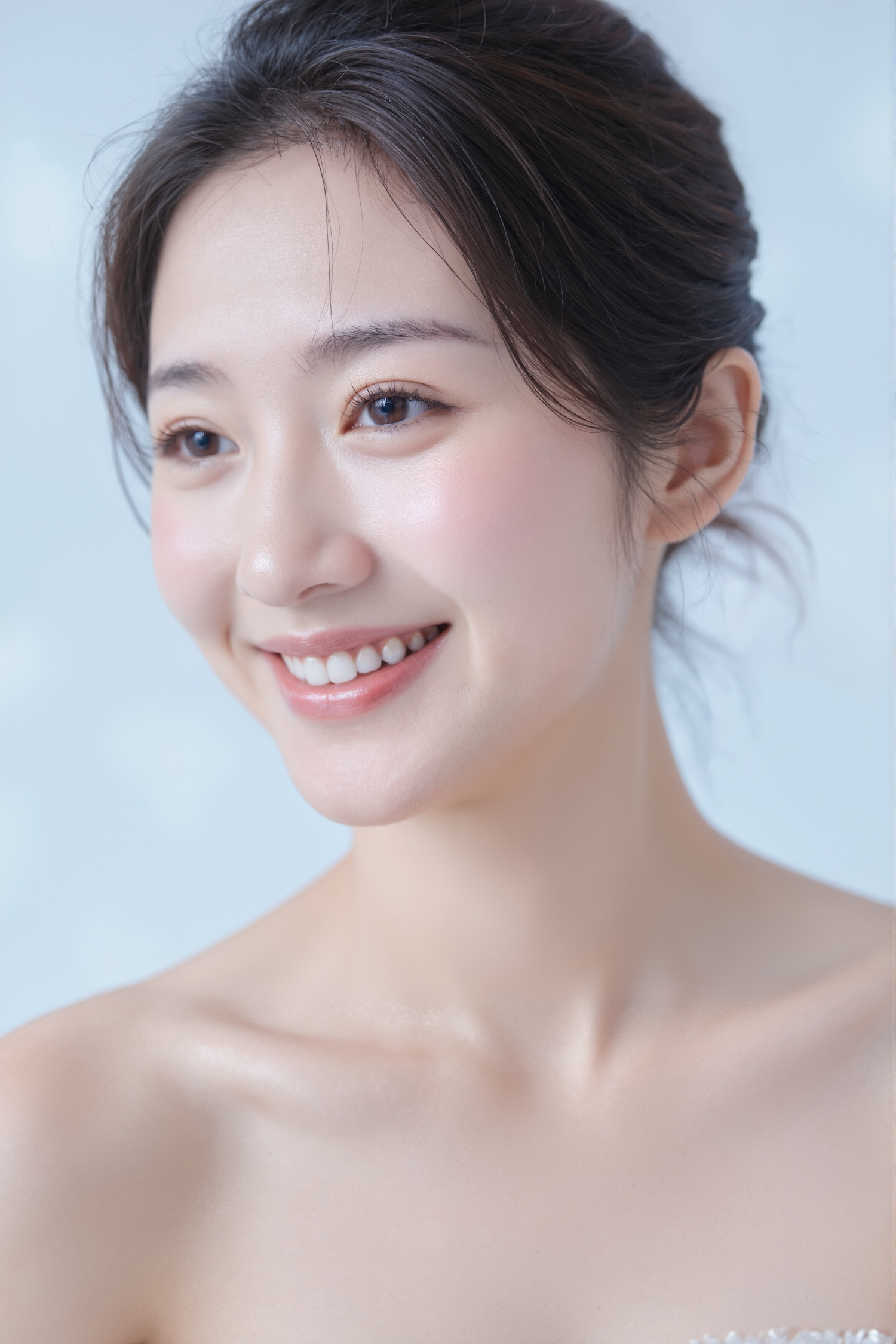 Close-up of a smiling woman with glowing skin, natural makeup, and a soft blue background, radiating a fresh and cheerful vibe.