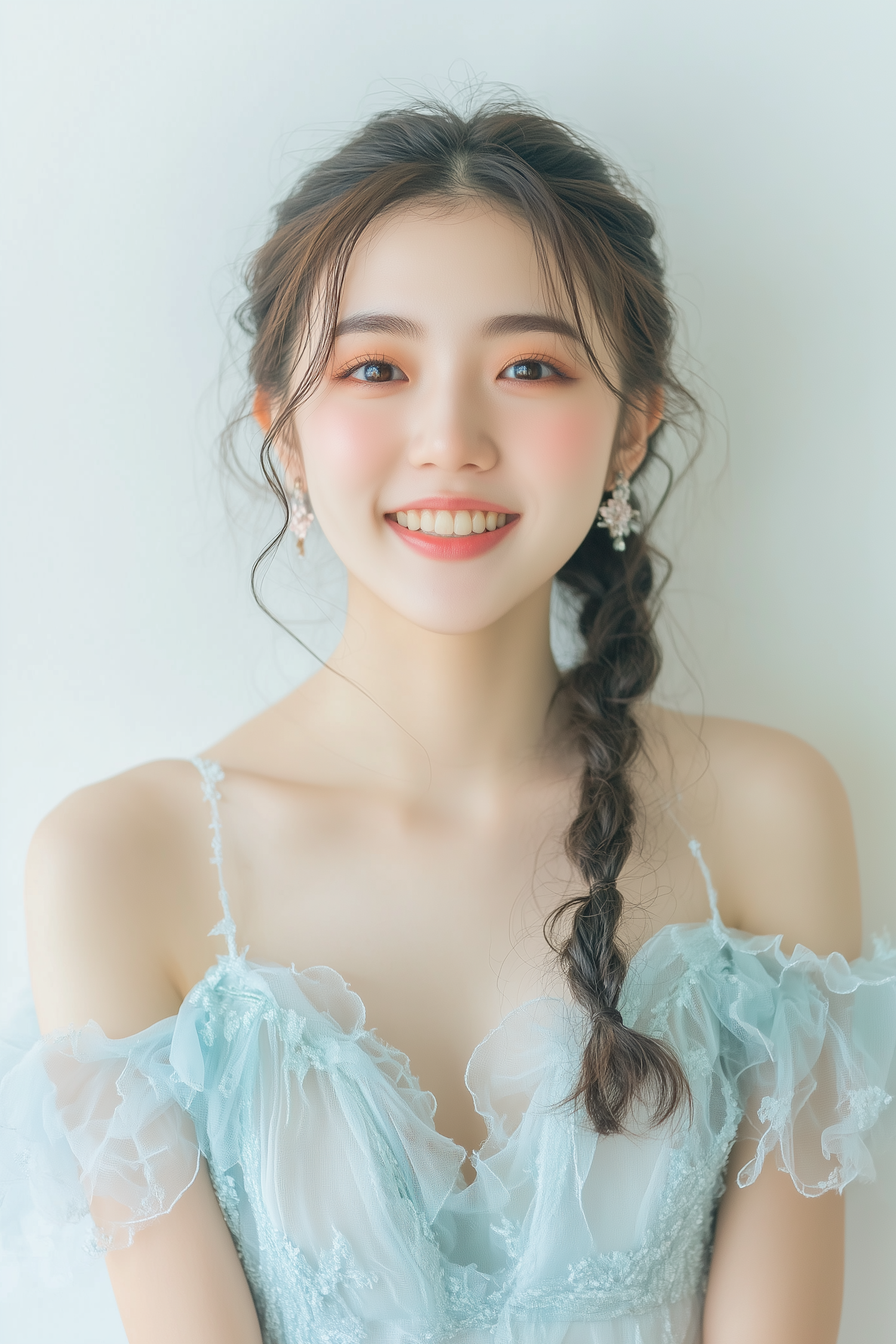 A young woman in a light blue lace dress with a loose braid and floral earrings smiles warmly against a softly lit background.