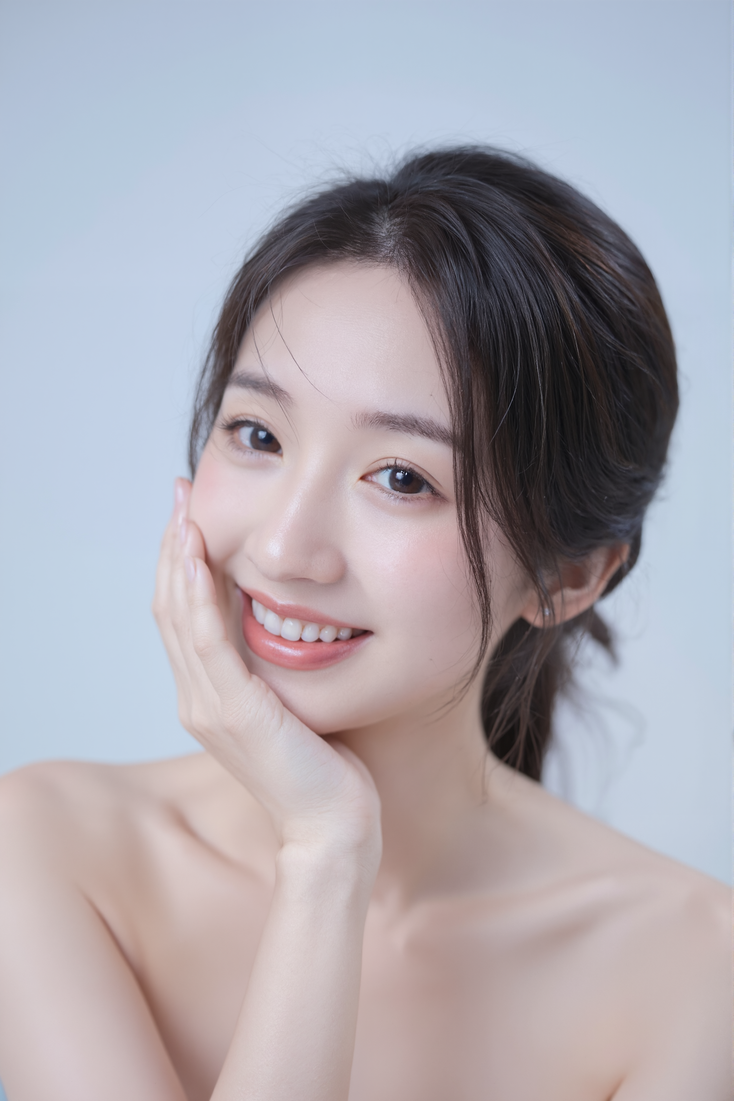 A young woman with glowing skin and a natural smile, resting her hand on her cheek against a soft blue background.