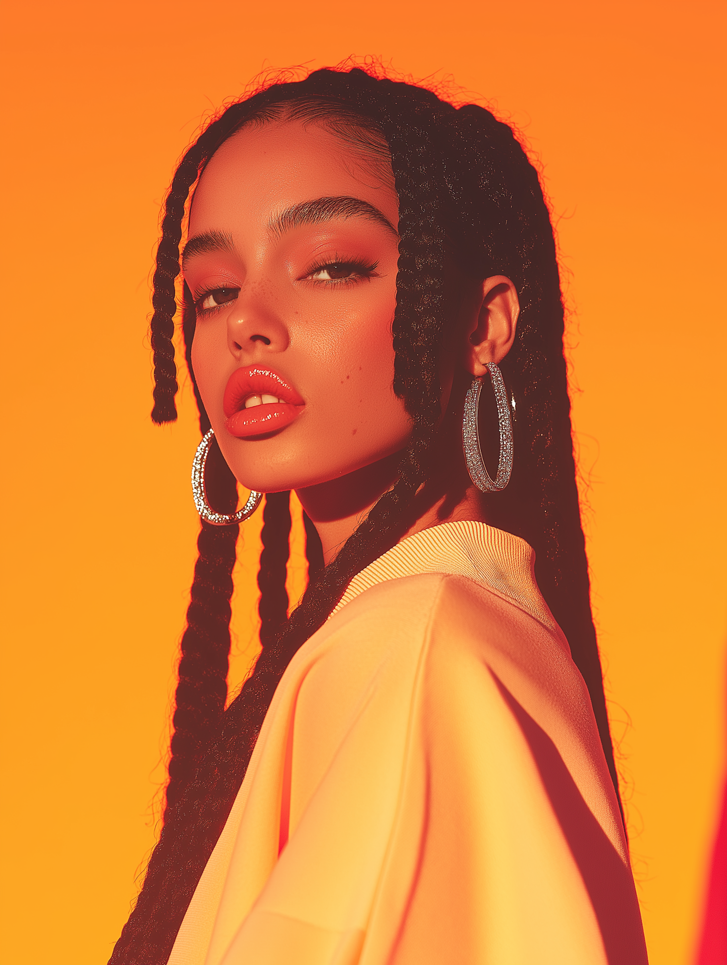 A stylish woman with long braids, bold makeup, and hoop earrings poses against a vibrant orange background, exuding confidence.