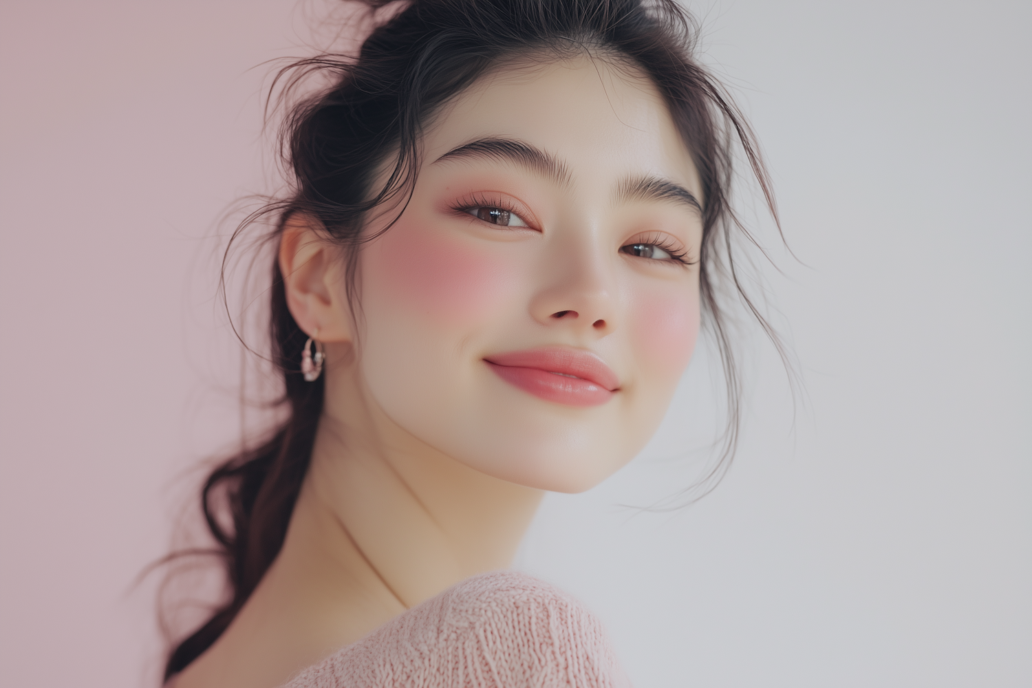 Close-up of a young woman with rosy cheeks, soft makeup, and a warm smile, set against a pink and white gradient background.