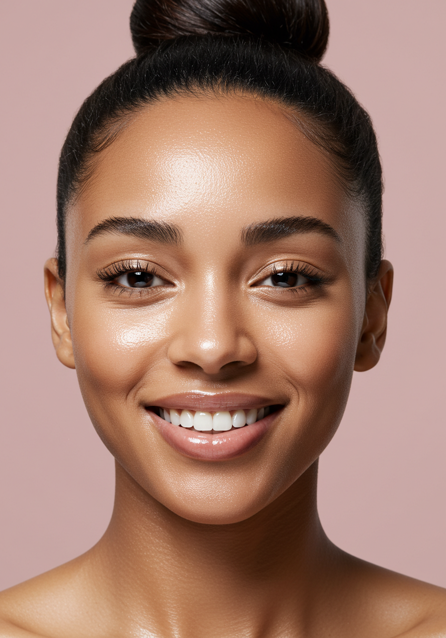 Close-up of a smiling woman with glowing skin, glossy lips, and a high bun against a soft pink background. Radiant and cheerful vibe.
