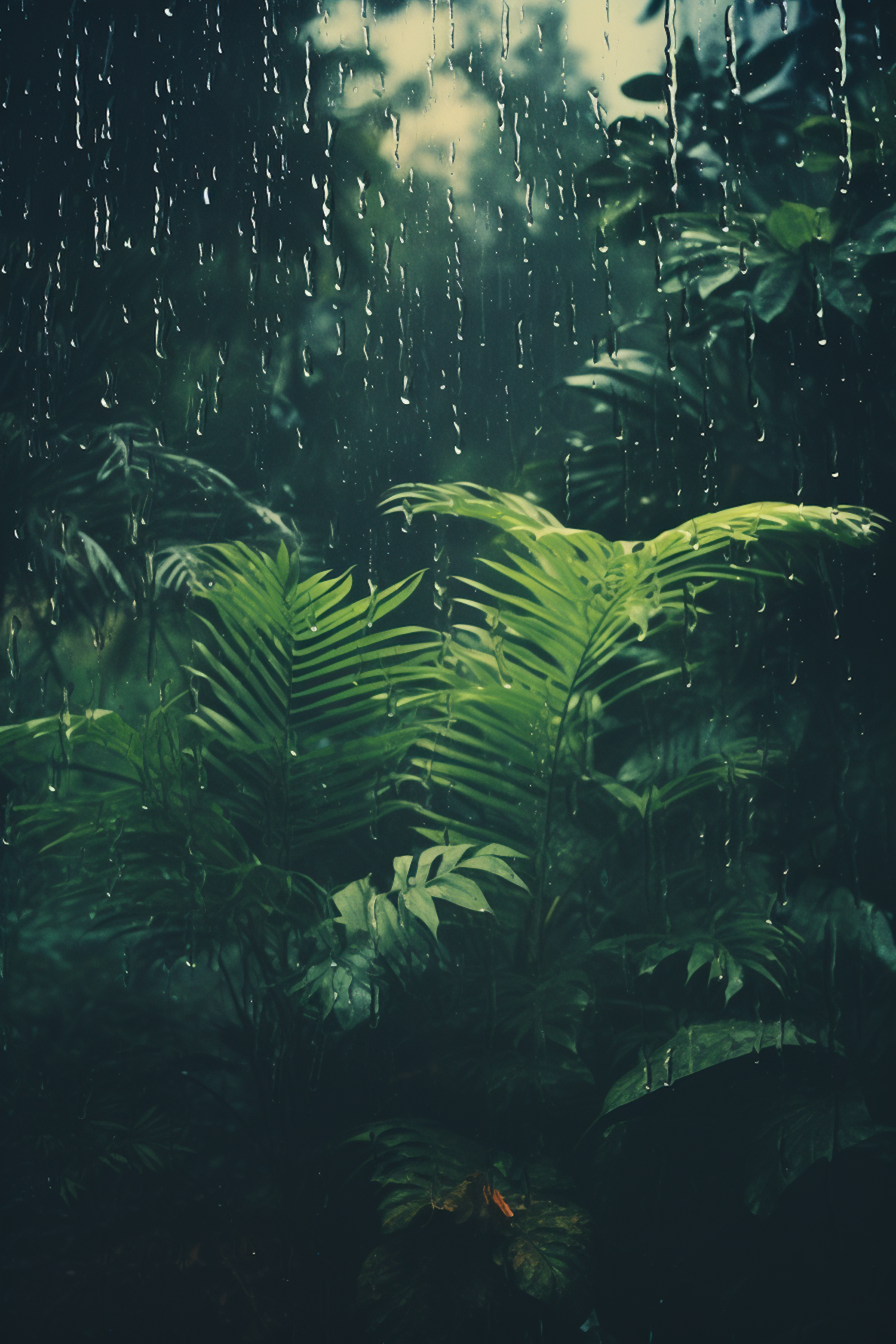 Lush green foliage in a rainforest setting, glistening with rain droplets, creating a serene and tranquil atmosphere.