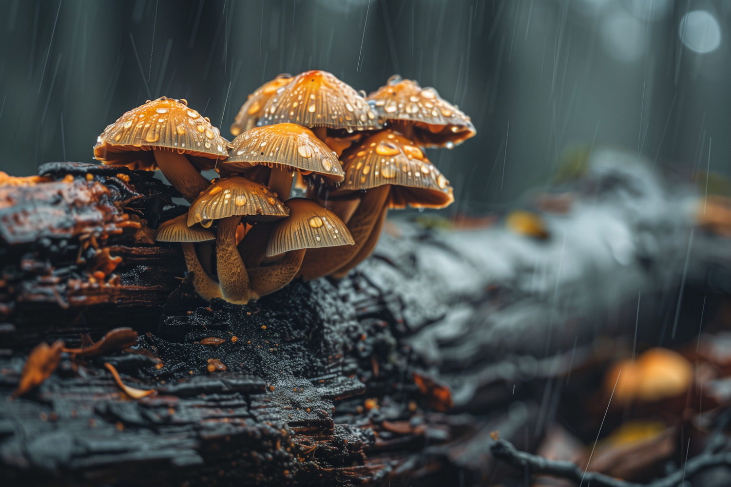 Golden-brown mushrooms with water droplets on a log in a rainy forest, creating a vibrant and earthy scene.