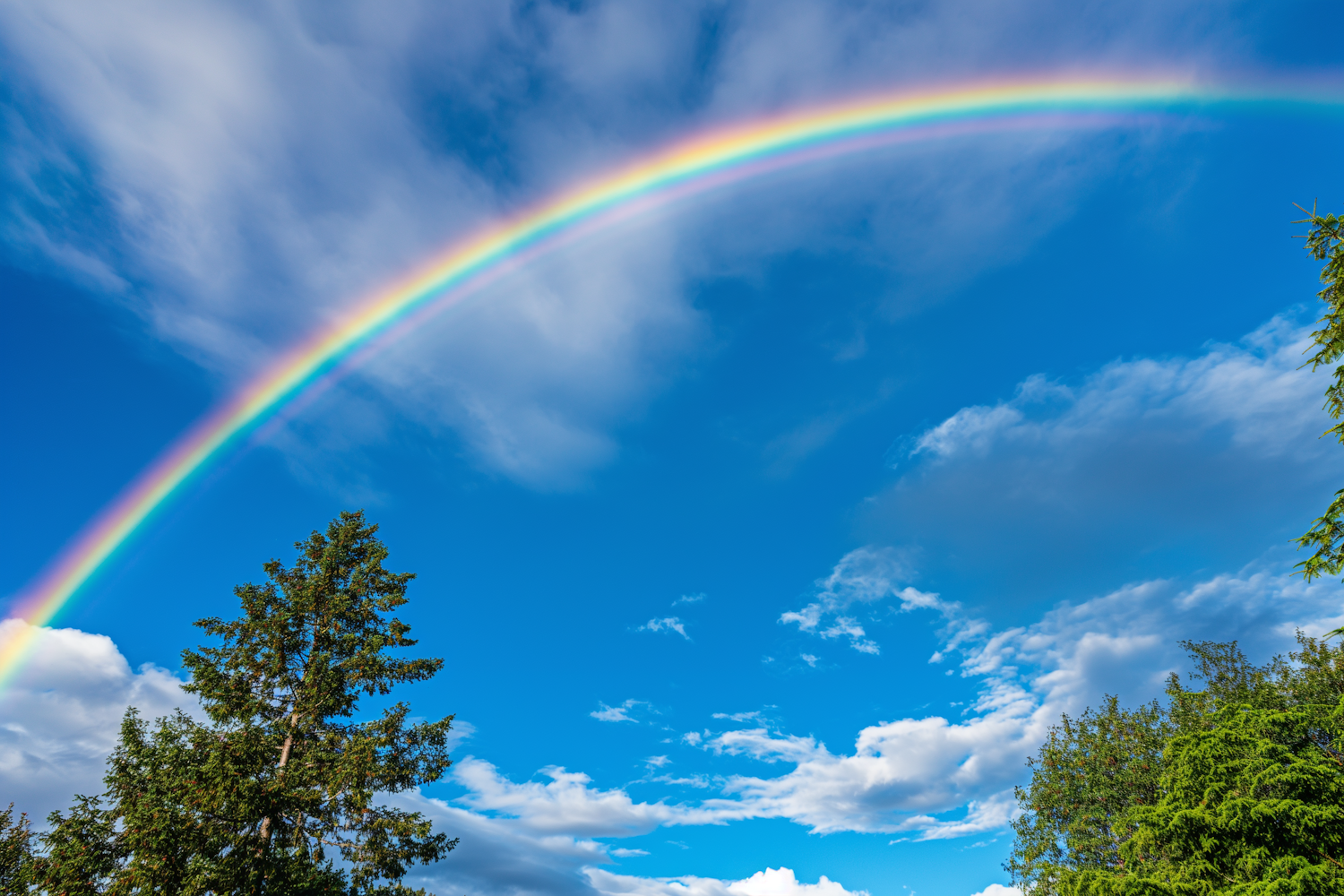 A vivid rainbow arches over a blue sky with fluffy clouds and lush green trees, creating a serene and picturesque landscape.