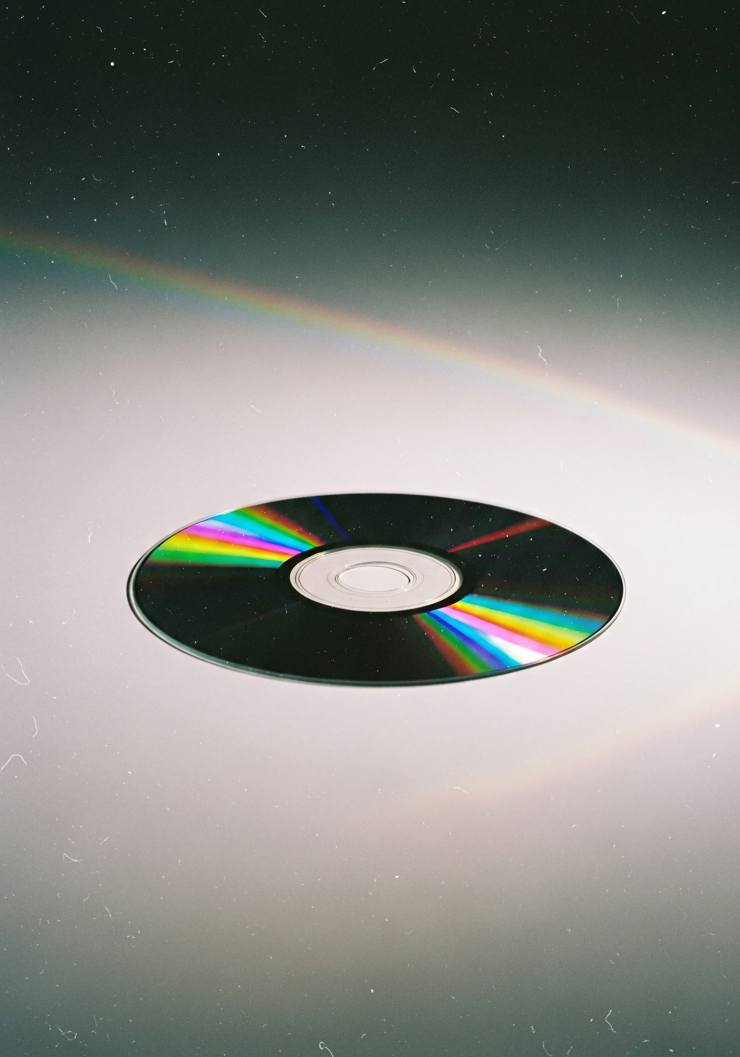 A CD reflecting vibrant rainbow colors against a gradient background, creating a minimalistic and visually striking composition.