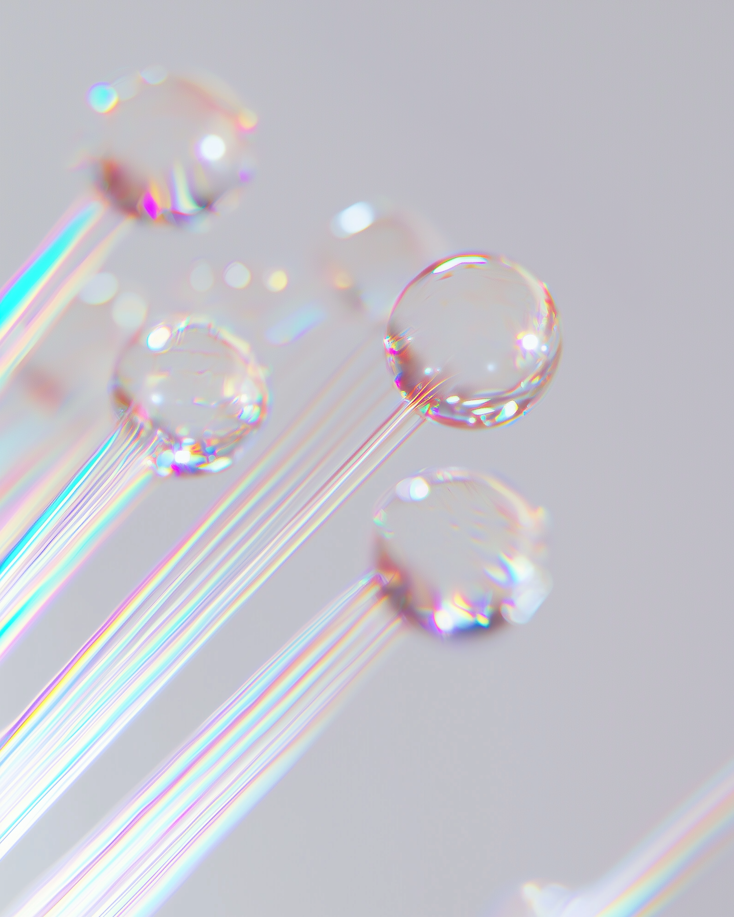 Close-up of transparent droplets on strands refracting rainbow colors, set against a soft gray background for a dreamy, ethereal effect.