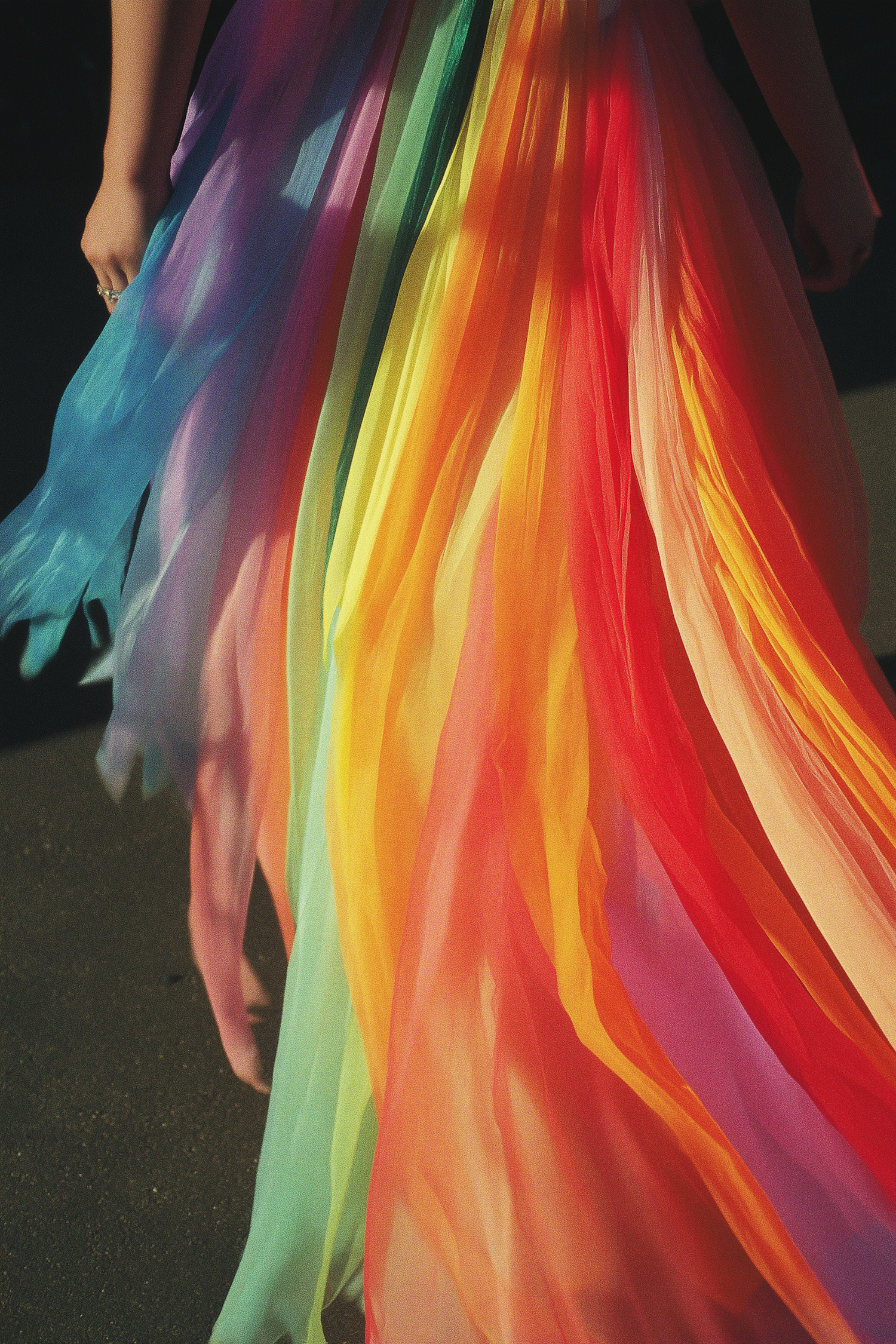 A stunning rainbow-colored dress flows gracefully, capturing light and shadow in a vibrant display of colors and textures.