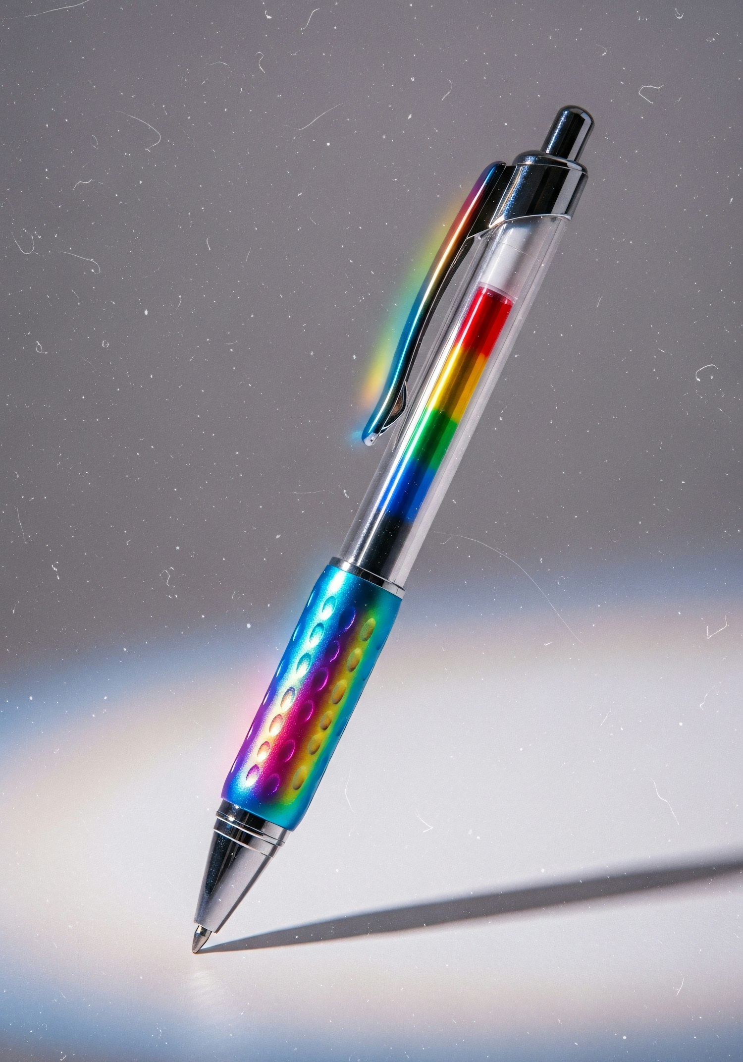 A vibrant pen with a rainbow grip and multicolored ink core, set against a neutral background with soft lighting and shadows.