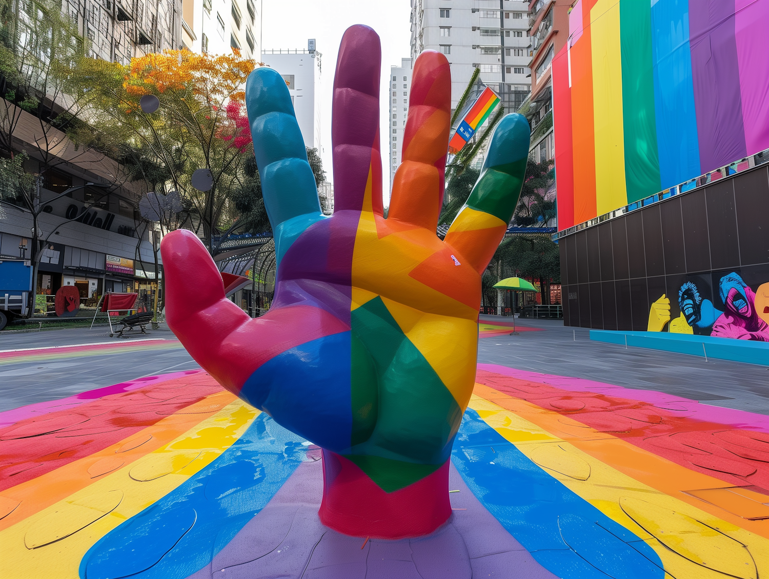 Colorful hand sculpture with rainbow stripes in an urban setting, surrounded by vibrant murals and rainbow banners.