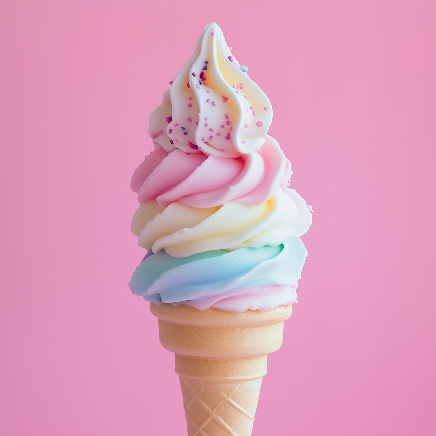 Pastel rainbow soft-serve ice cream with sprinkles in a waffle cone against a pink background. Perfectly sweet and colorful treat!