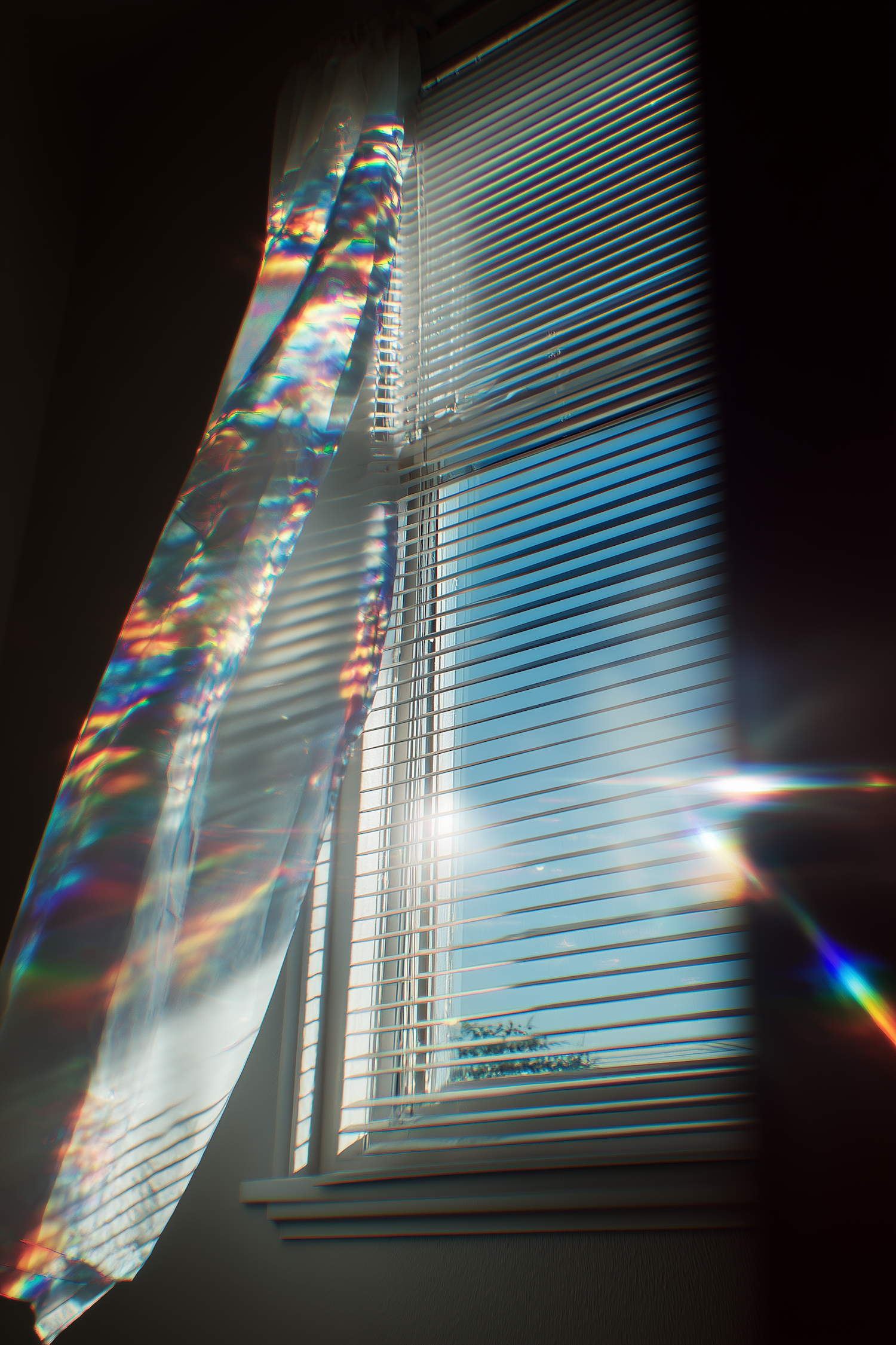 Sunlight filters through white blinds and a sheer curtain, creating a stunning rainbow refraction against a backdrop of a clear blue sky.