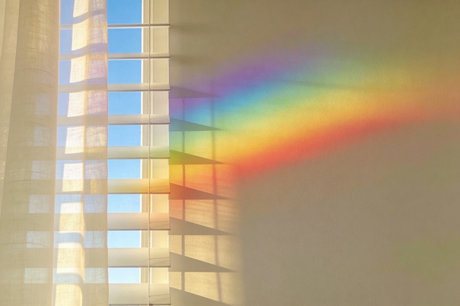 Sunlight through blinds creates a vivid rainbow on a beige wall, blending natural light and color in a serene indoor setting.