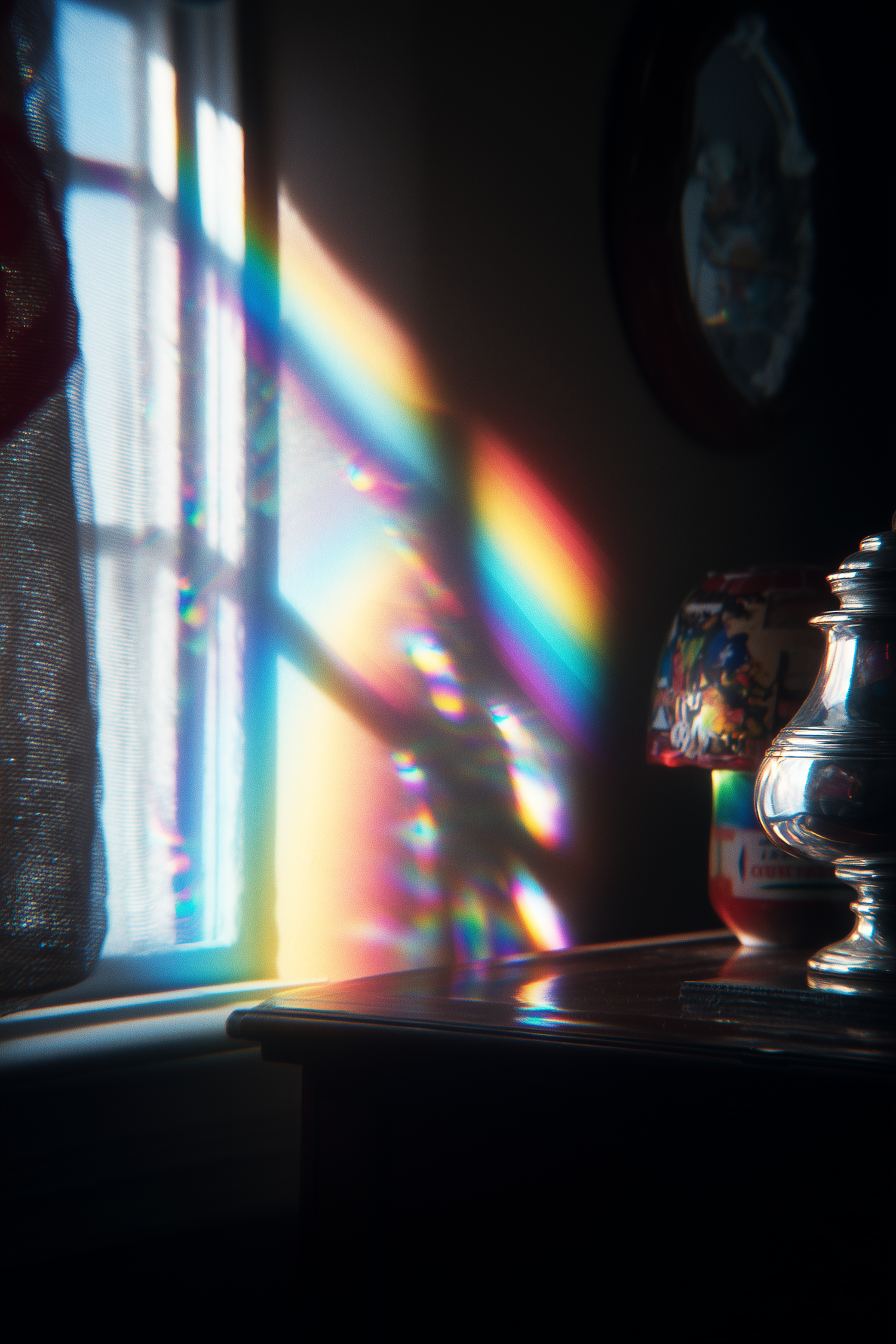 Light through a window creates a rainbow on a wall, with a lamp and silver vase adding character to this colorful display.