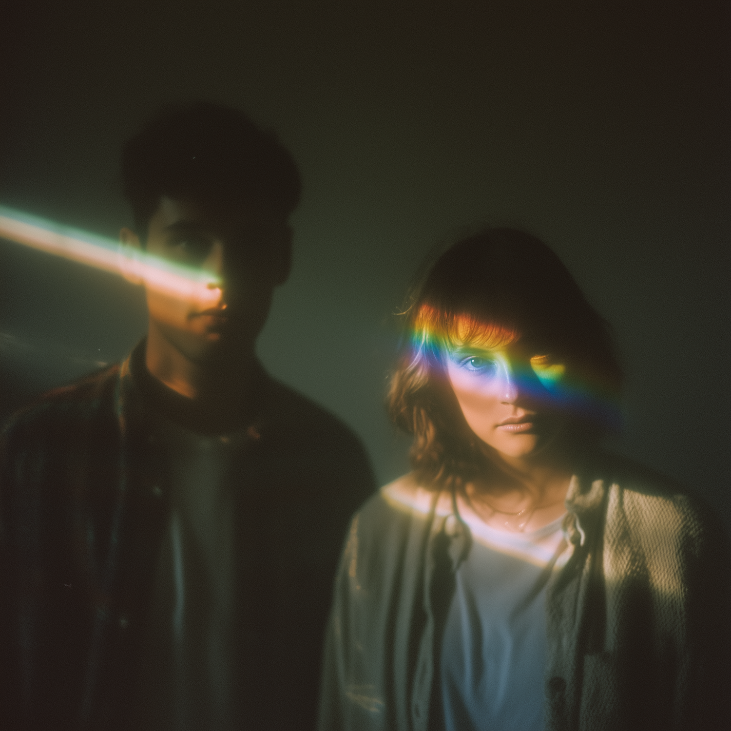 Two individuals in a dimly lit setting, with a vibrant rainbow light effect crossing one person's face, creating a dramatic atmosphere.