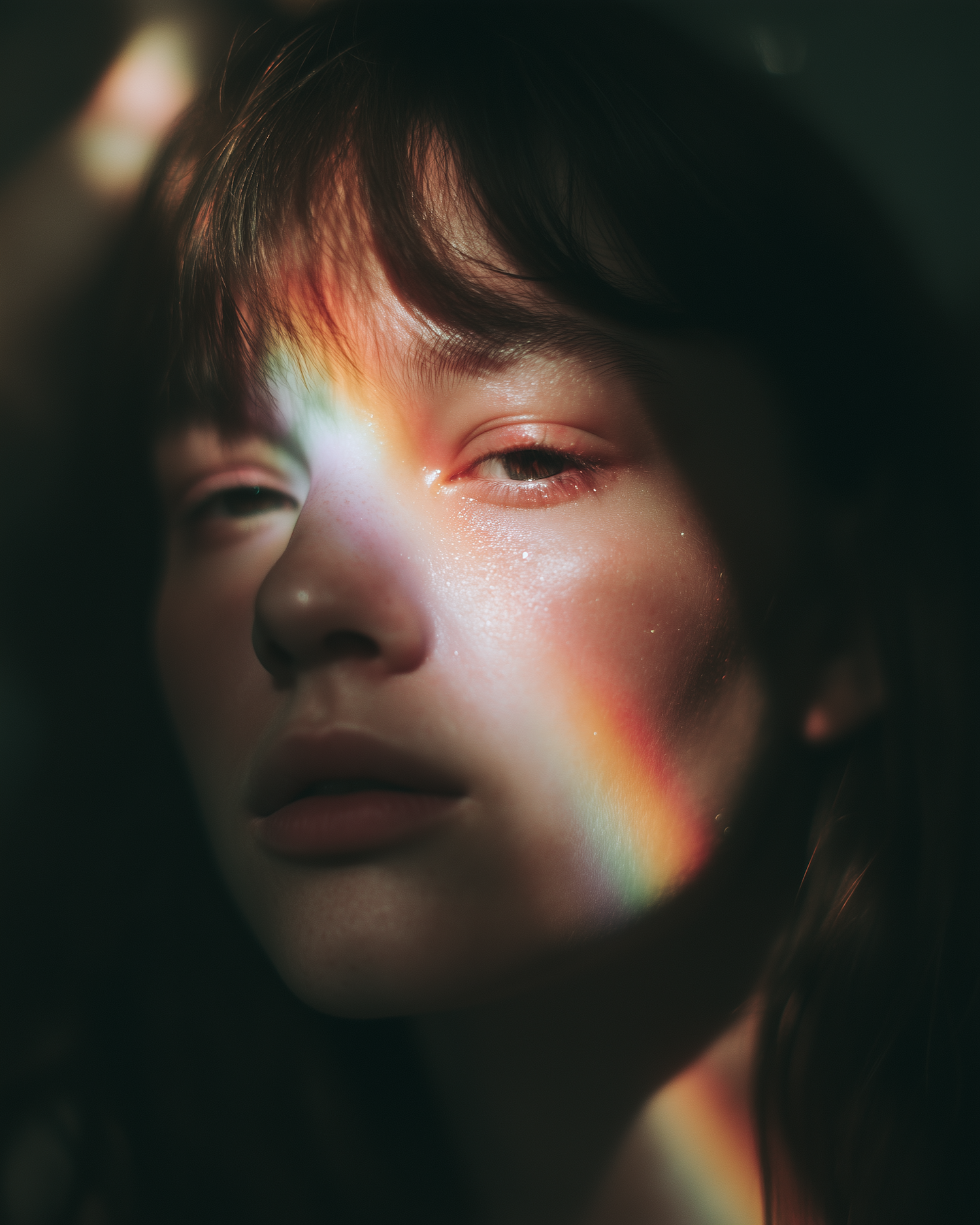 Close-up of a person with a rainbow light spectrum on their face, creating a serene and artistic visual effect.