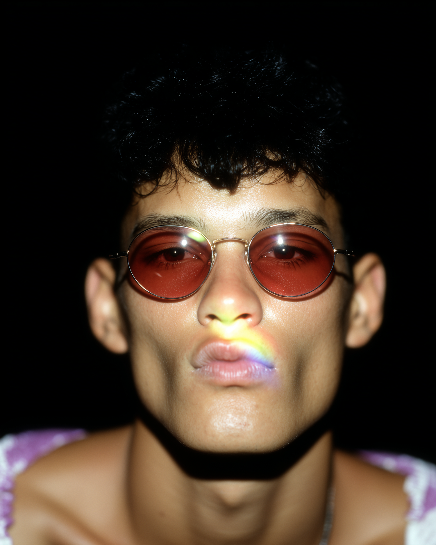 Close-up portrait of an individual wearing red-tinted sunglasses with a rainbow light beam on their lips, set against a dark background.