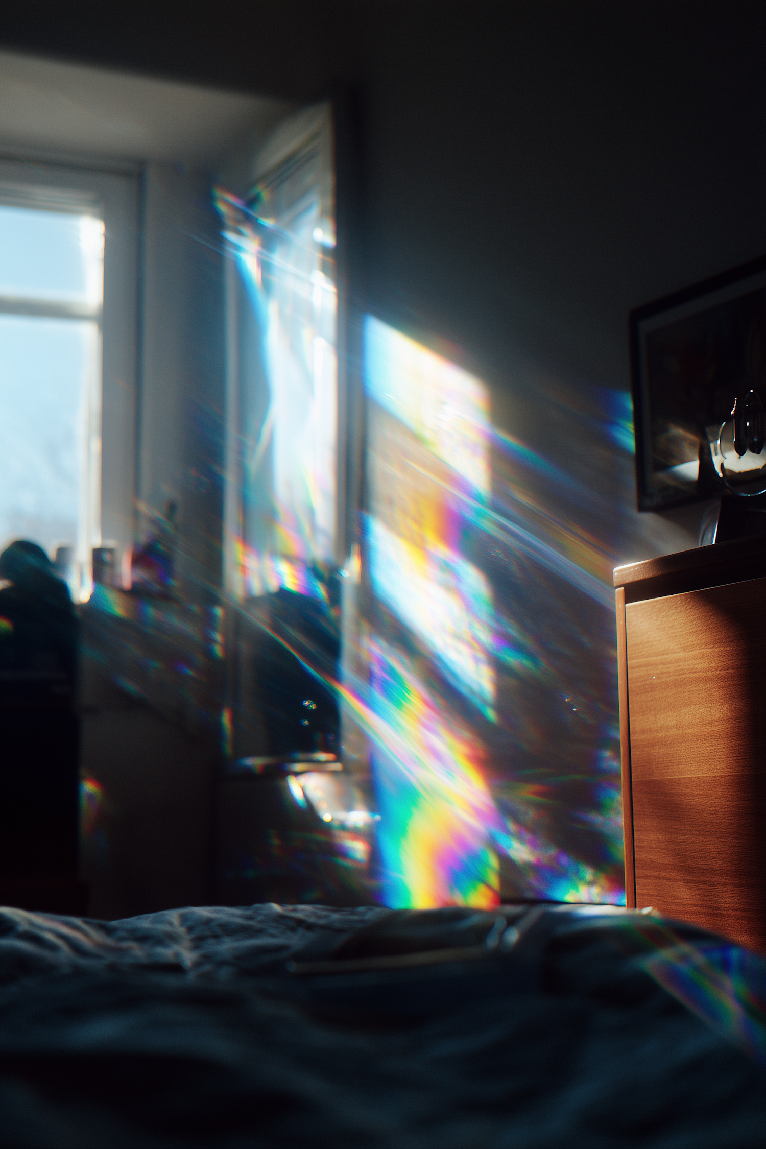 Sunlight refracts through a window, casting colorful rainbow patterns on walls and furniture in a cozy, softly lit room.
