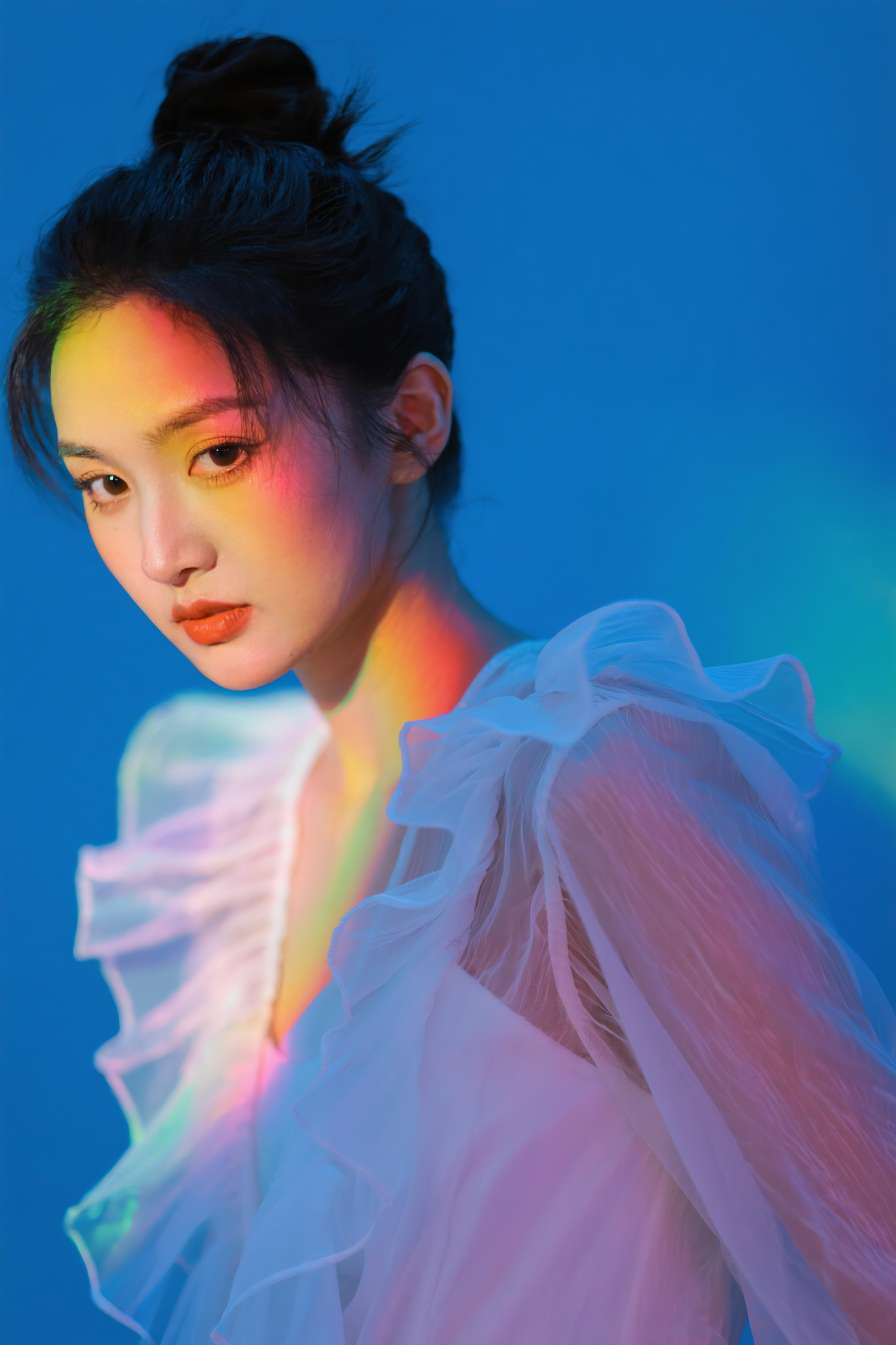 A woman in a sheer white top with rainbow lighting on her face, set against a vivid blue background. Artistic and vibrant portrait.