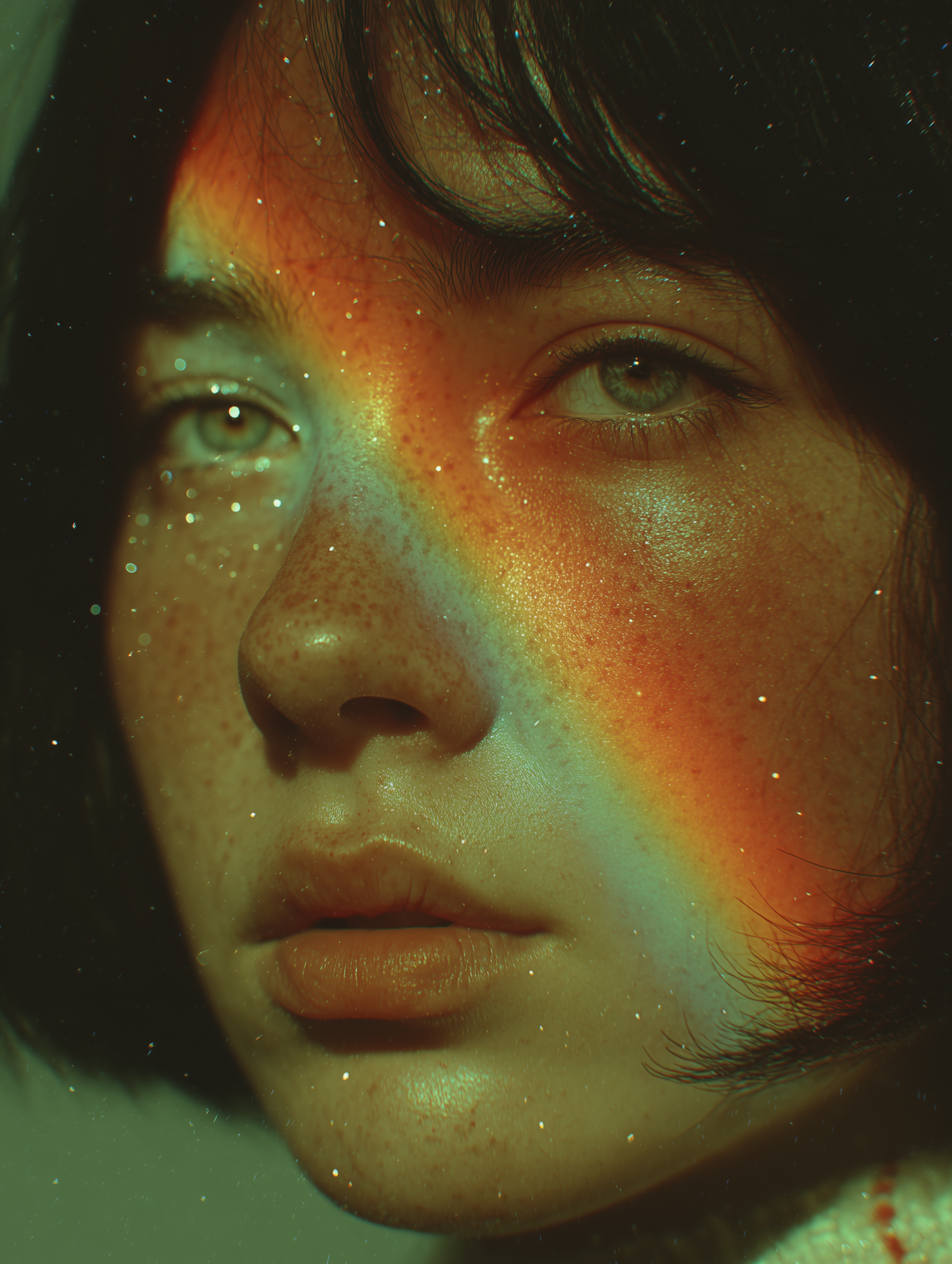 Close-up of a freckled face with a rainbow light effect, short dark hair, and green eyes, creating a dreamy and artistic vibe.